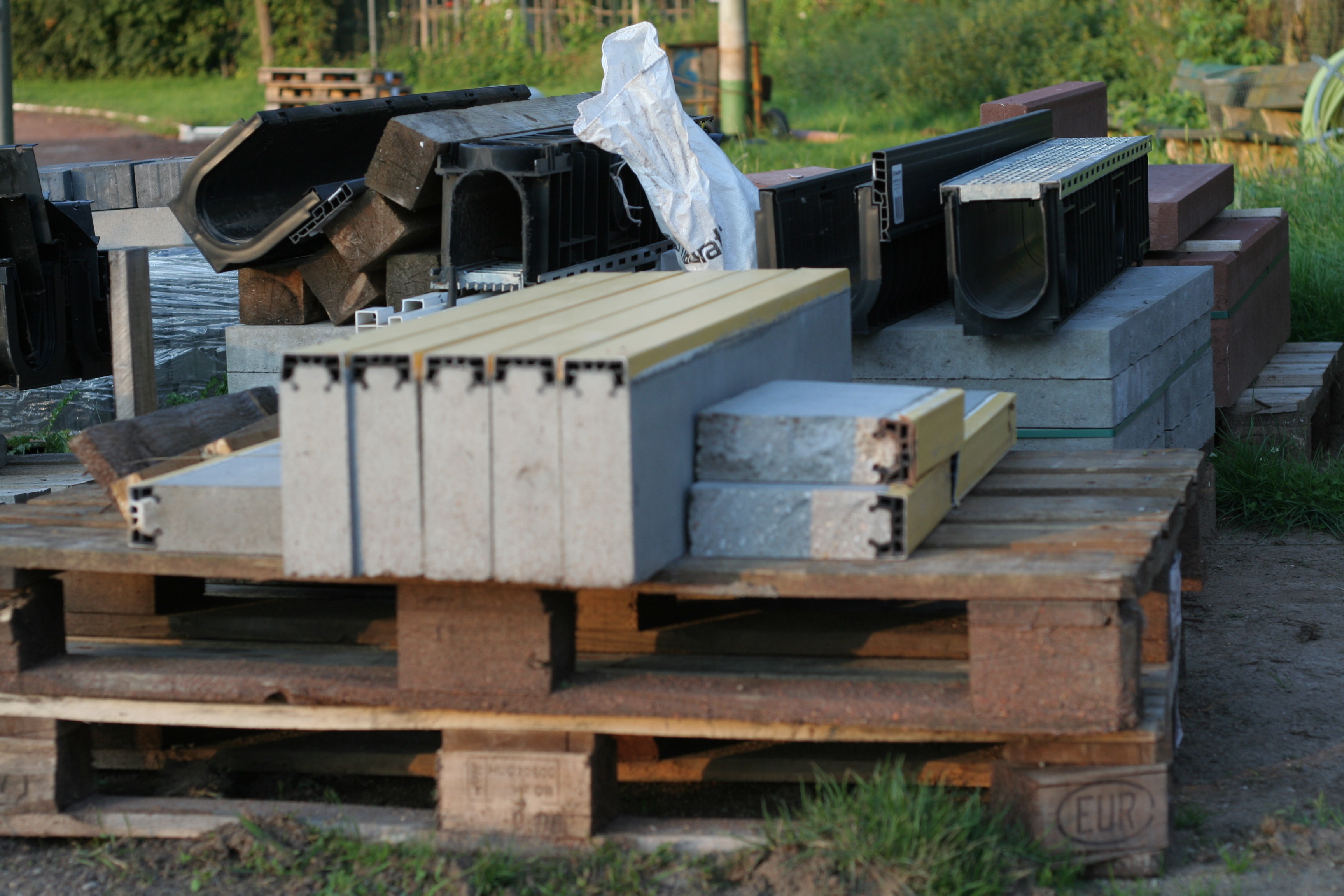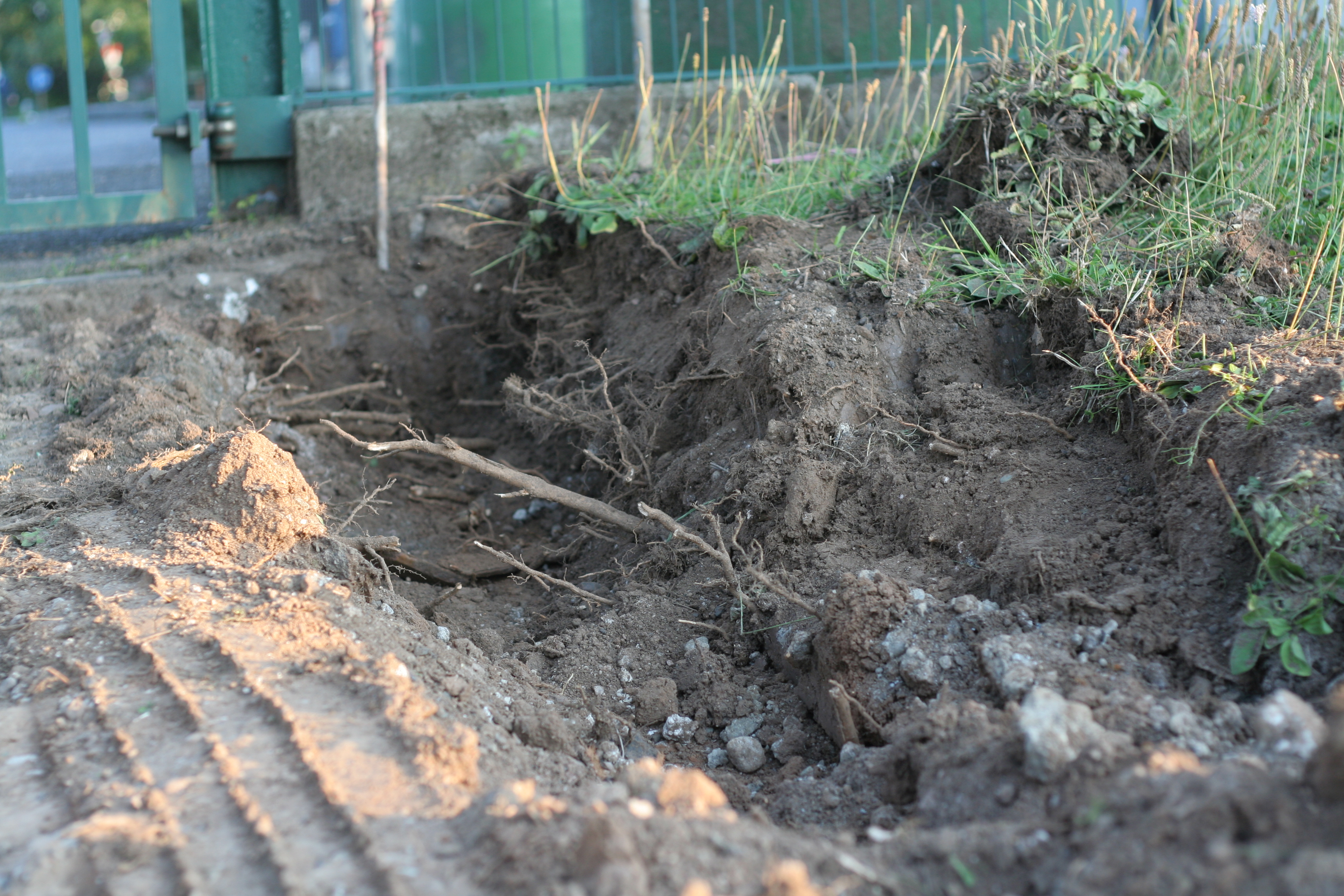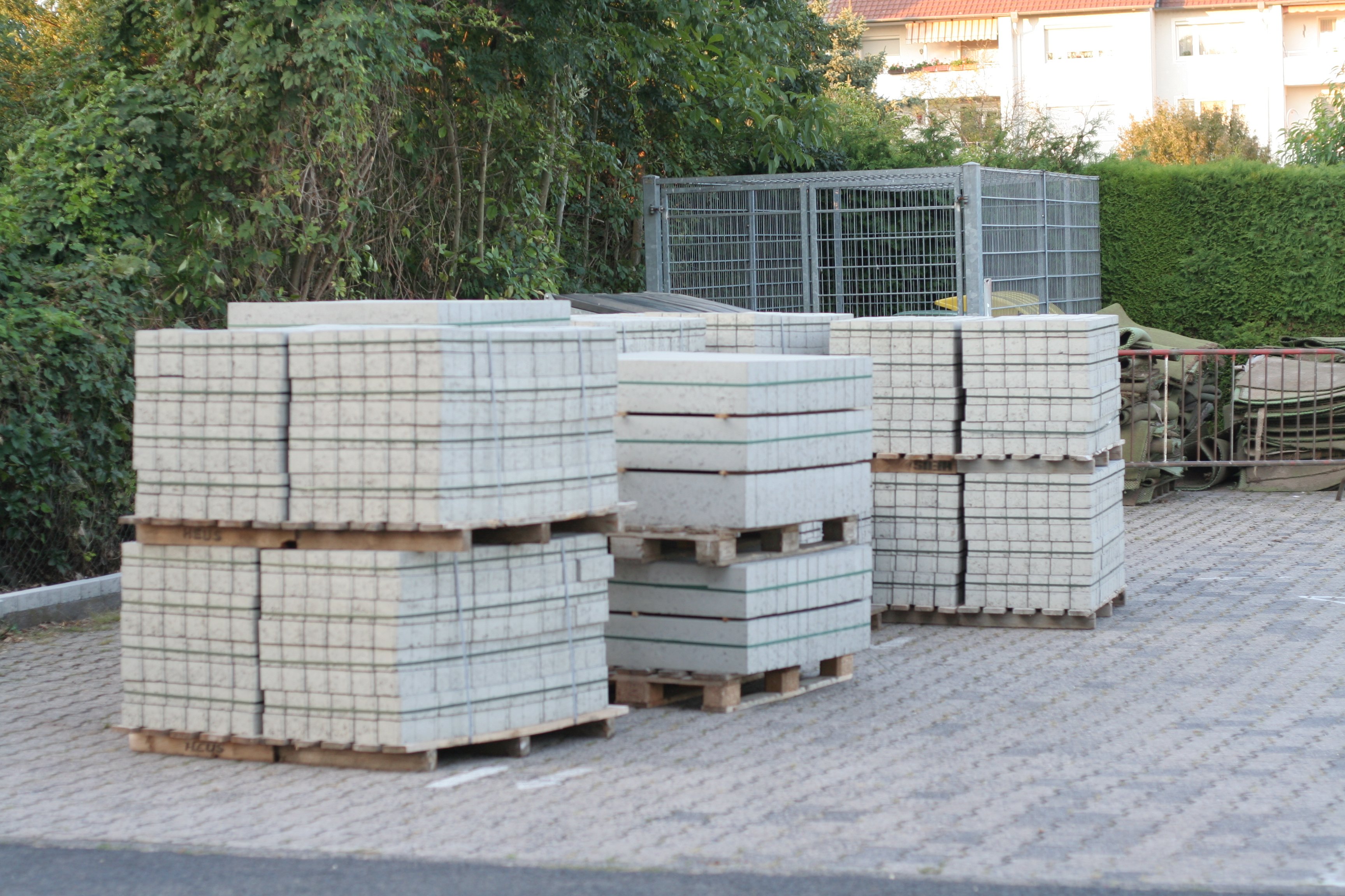 Unterdessen beginnen die Arbeiten im Eingangsbereich. Ein Bagger hat bereits mit den Wurzeln im Rasen direkt am Zaun gekämpft. Die Steine für die Zufahrt wurden bereits geliefert.