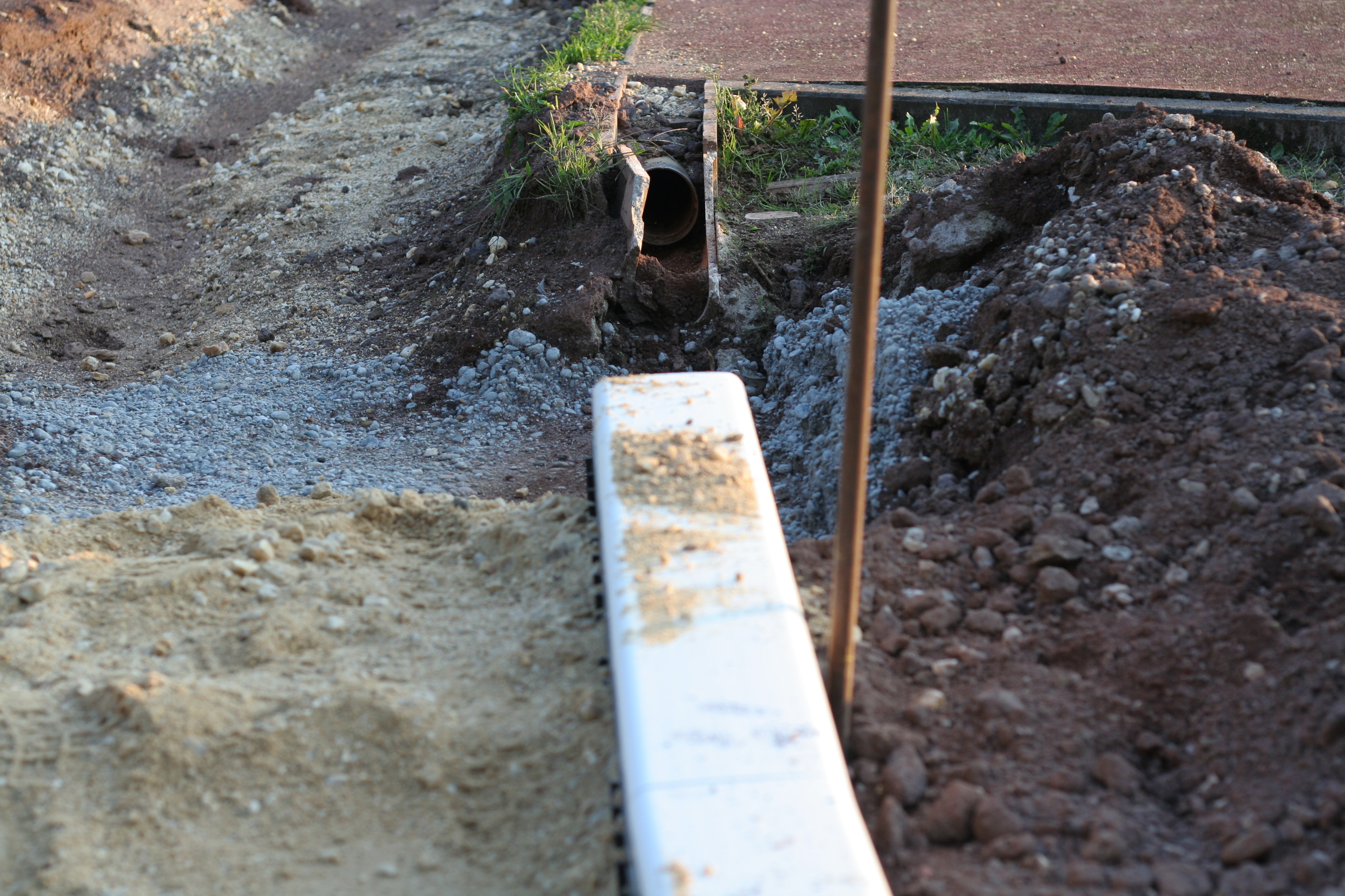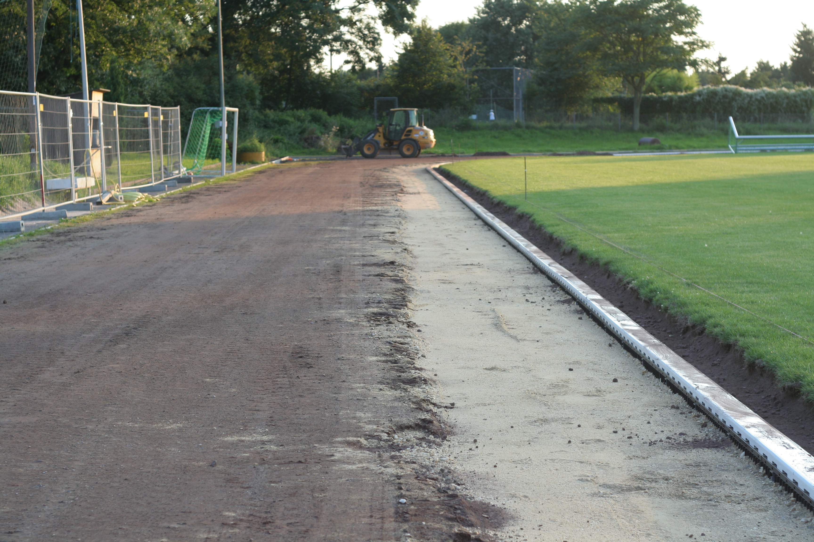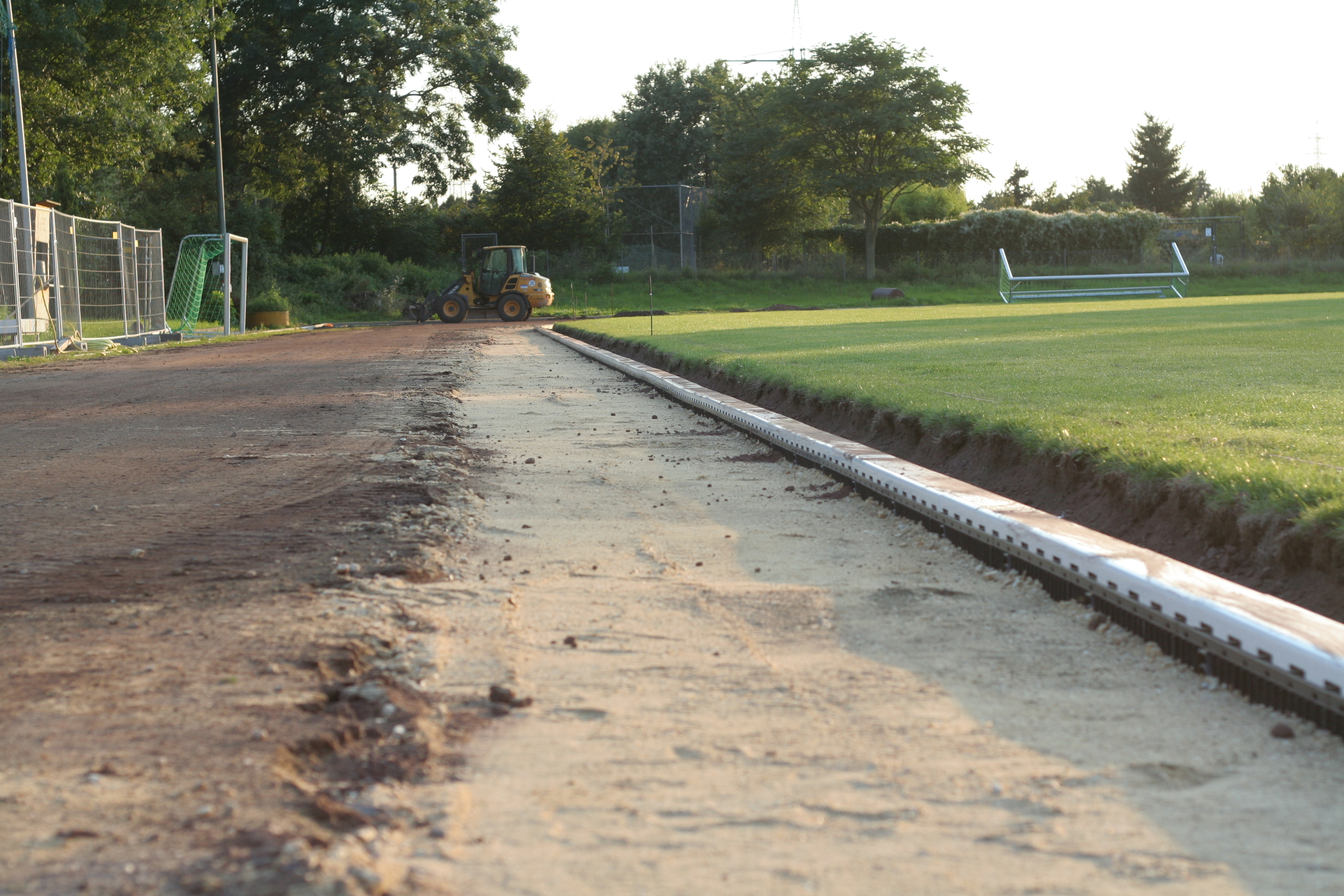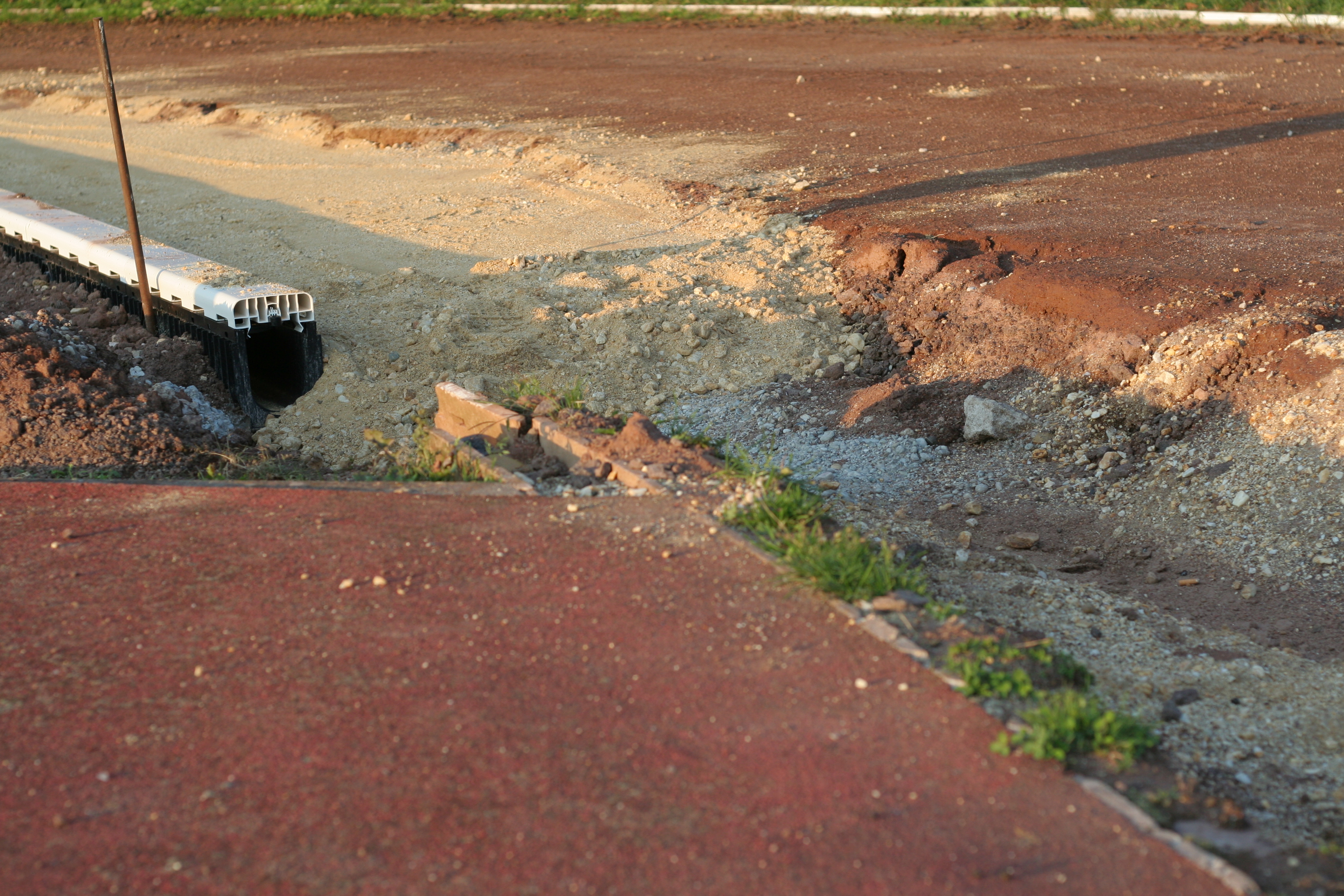 Die Arbeiten an der Drainage sind an einem großen Bereich der Bahn fast fertig. Lediglich der Bereich am Anlauf für die Weitsprunggrube ist bisher noch gar nichts verändert wurden.