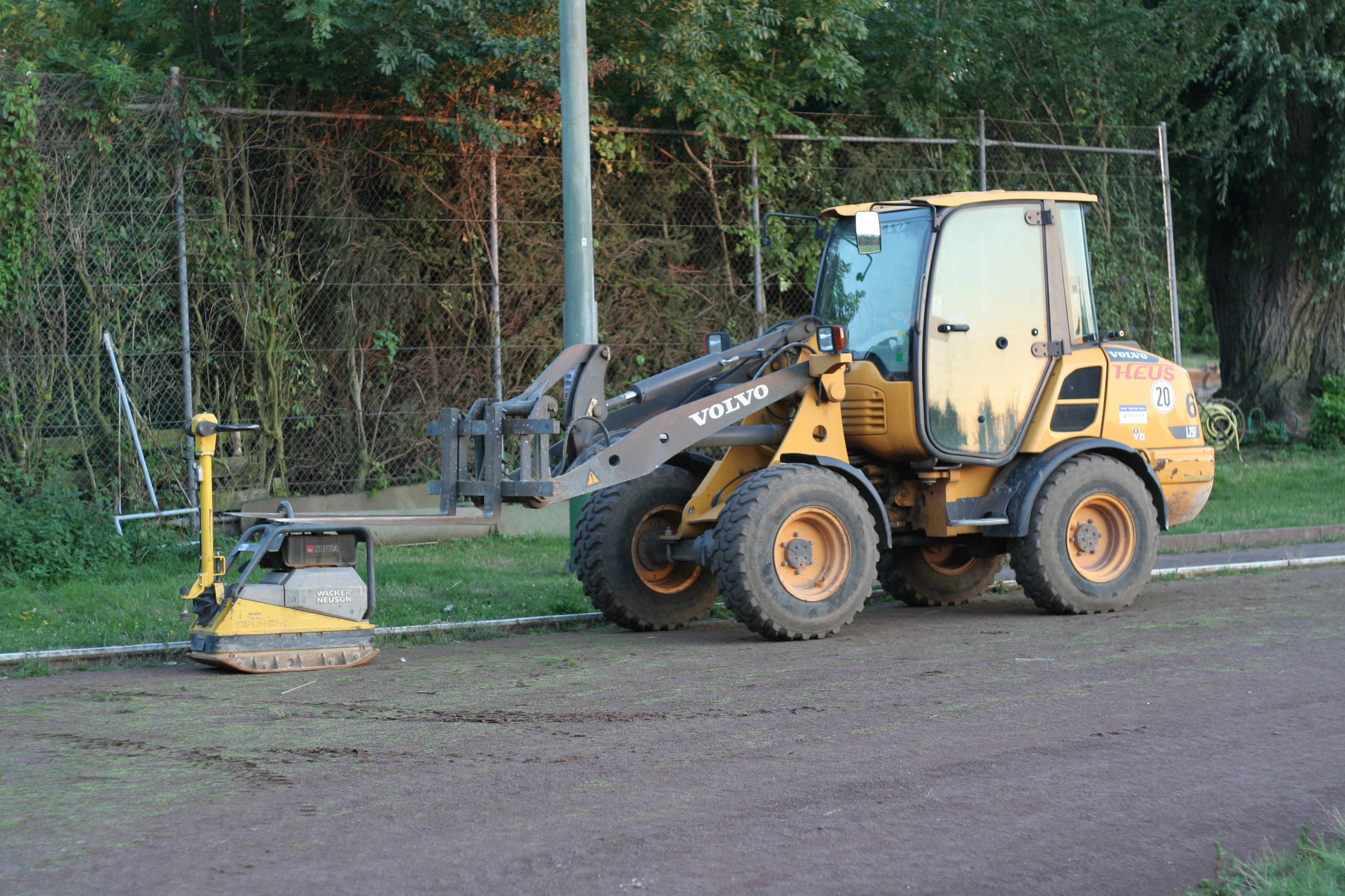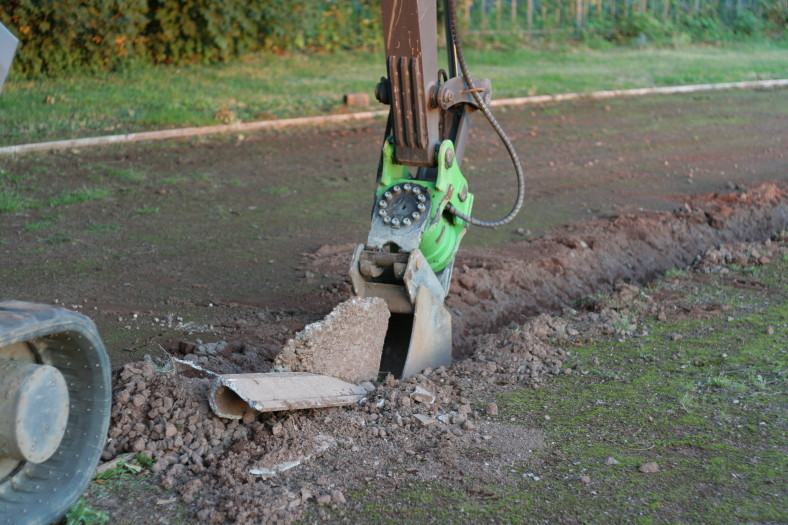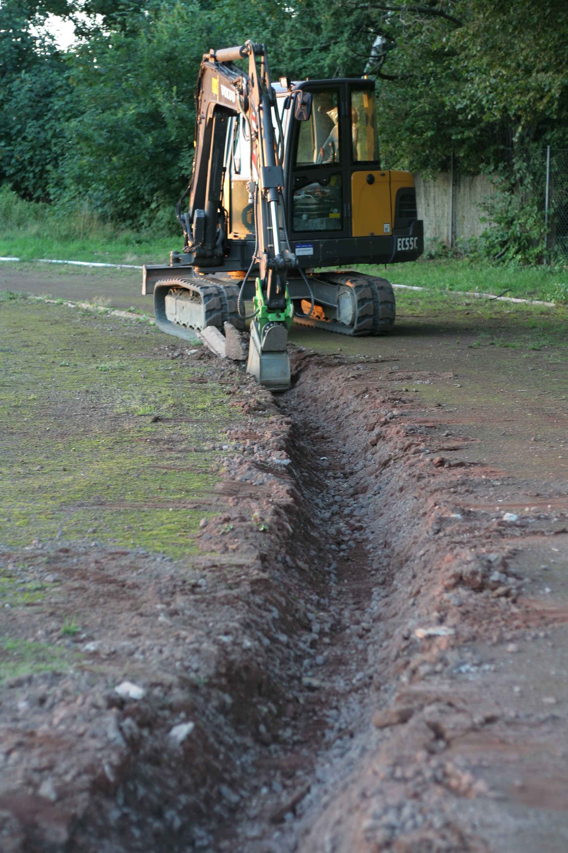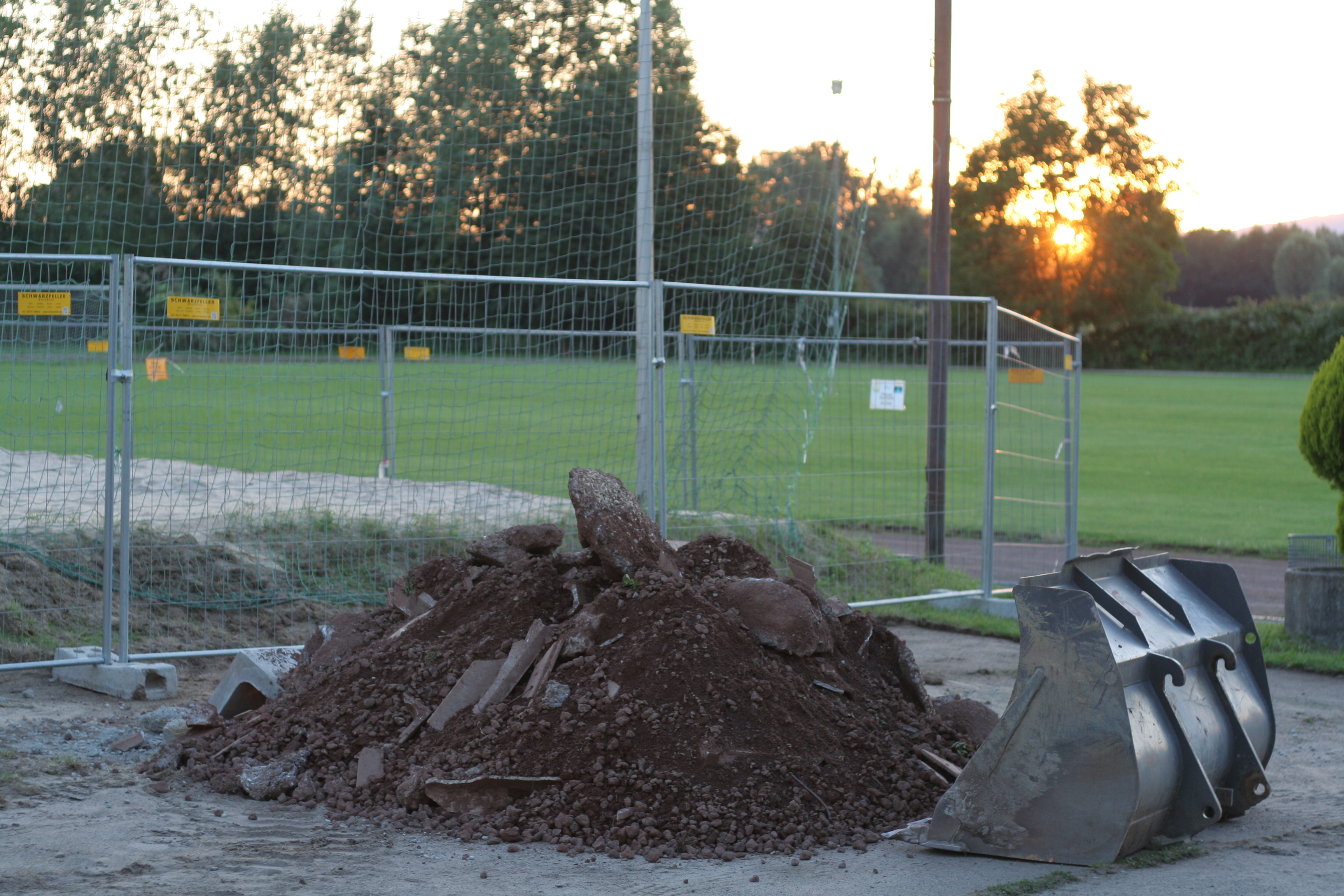 Die Bauarbeiter haben angefangen, in der Ostkurve der Aschebahn das Fundament der alten, zum Teil eingebrochenen Drainage auszugraben. Die weißen Abdeckungen liegen sauber gestapelt auf Paletten.