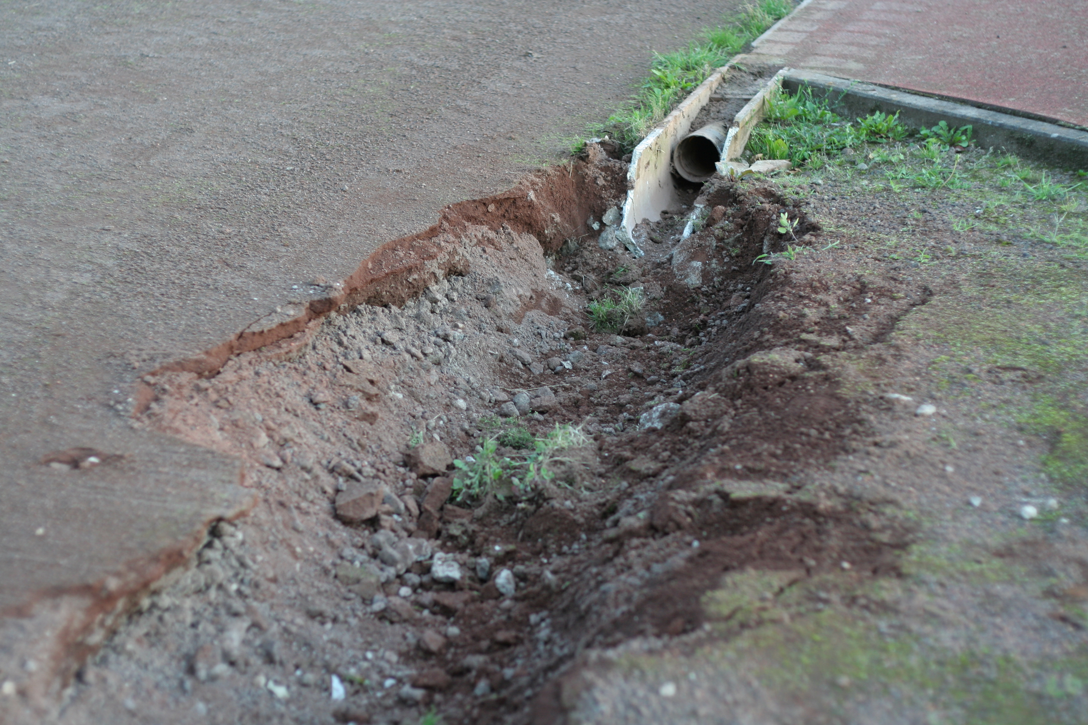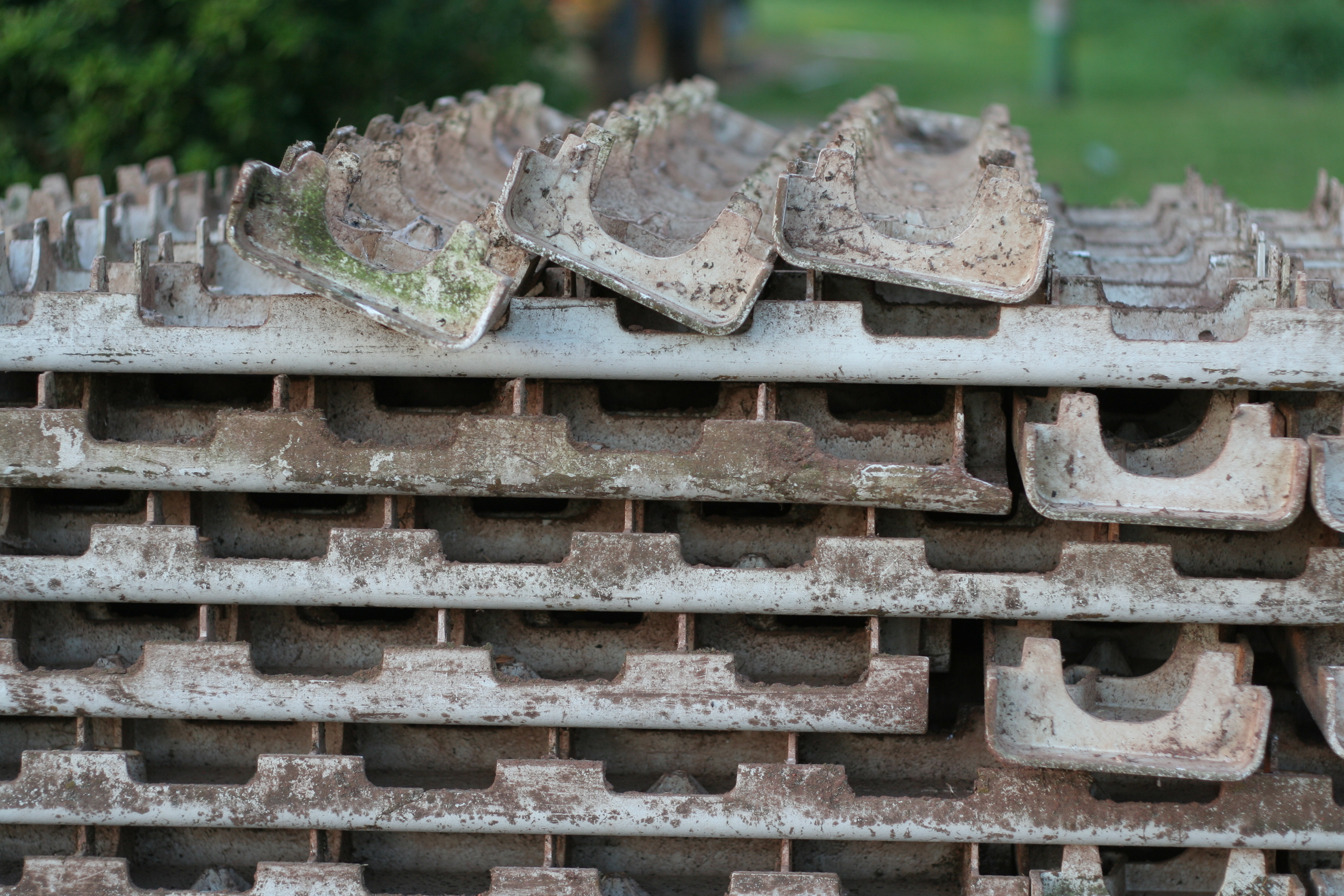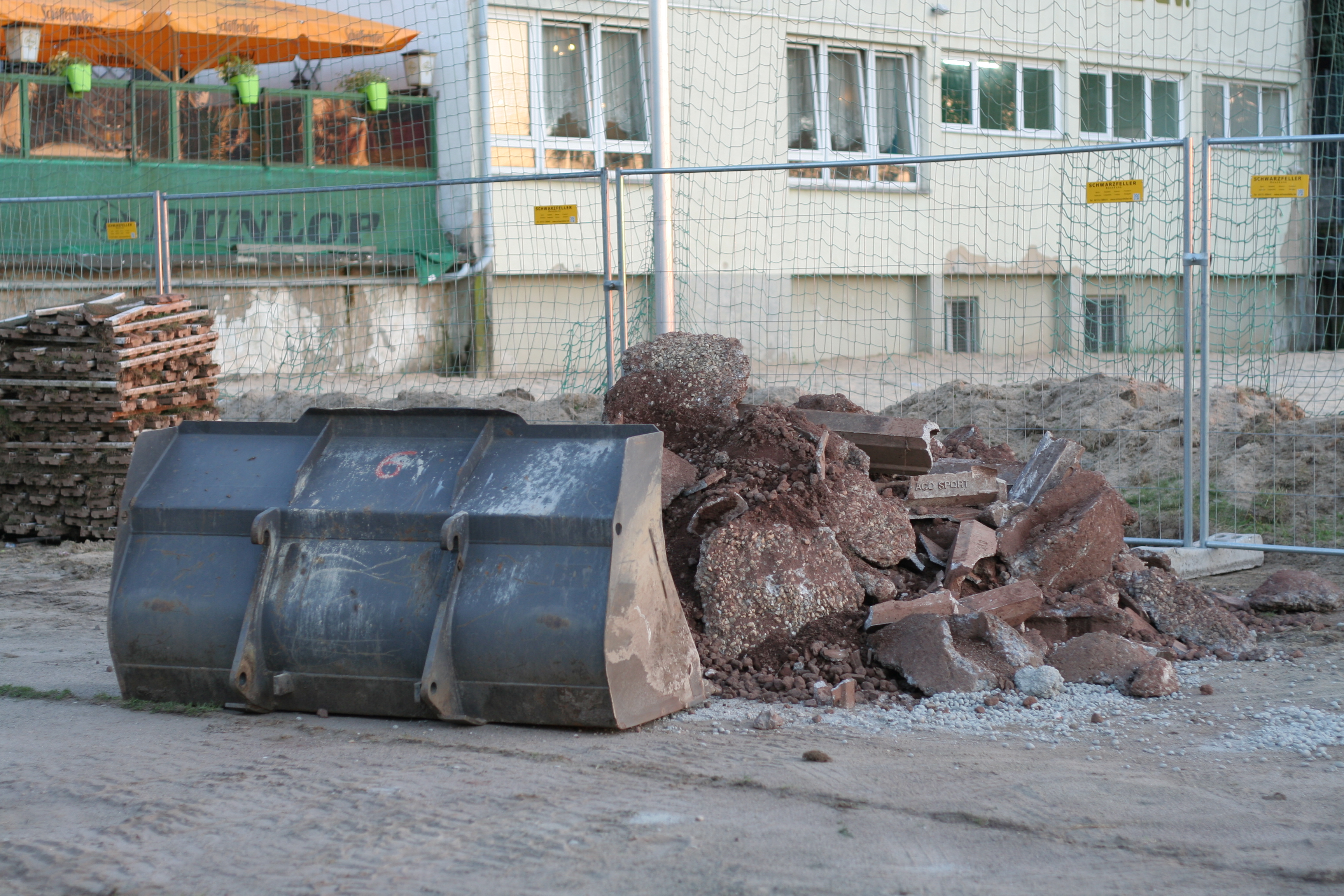 Die Bauarbeiter haben angefangen, in der Ostkurve der Aschebahn das Fundament der alten, zum Teil eingebrochenen Drainage auszugraben. Die weißen Abdeckungen liegen sauber gestapelt auf Paletten.