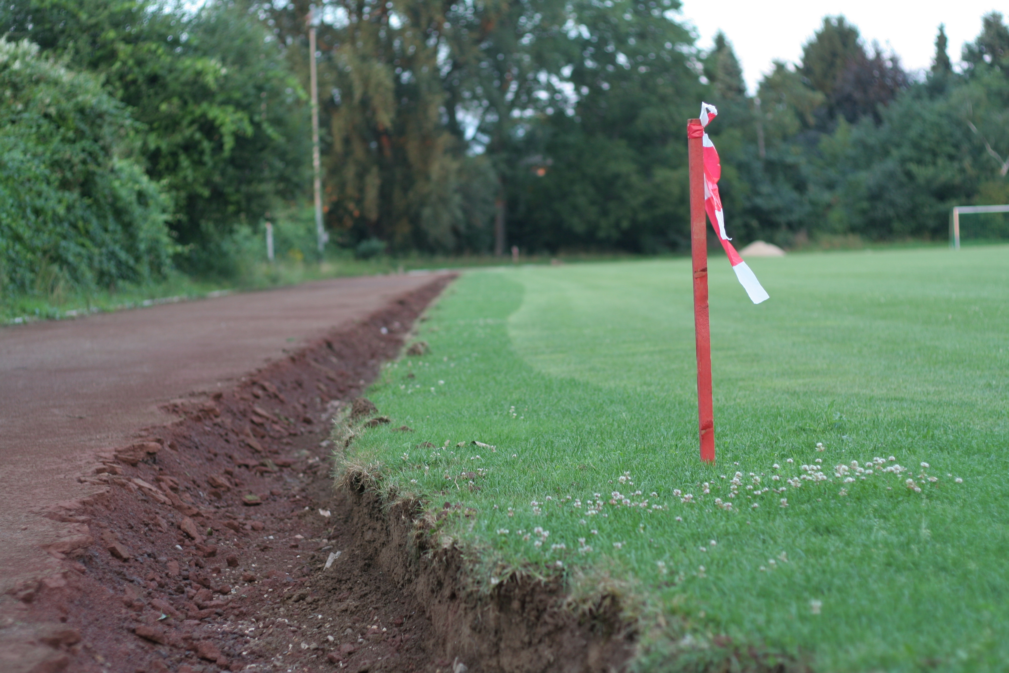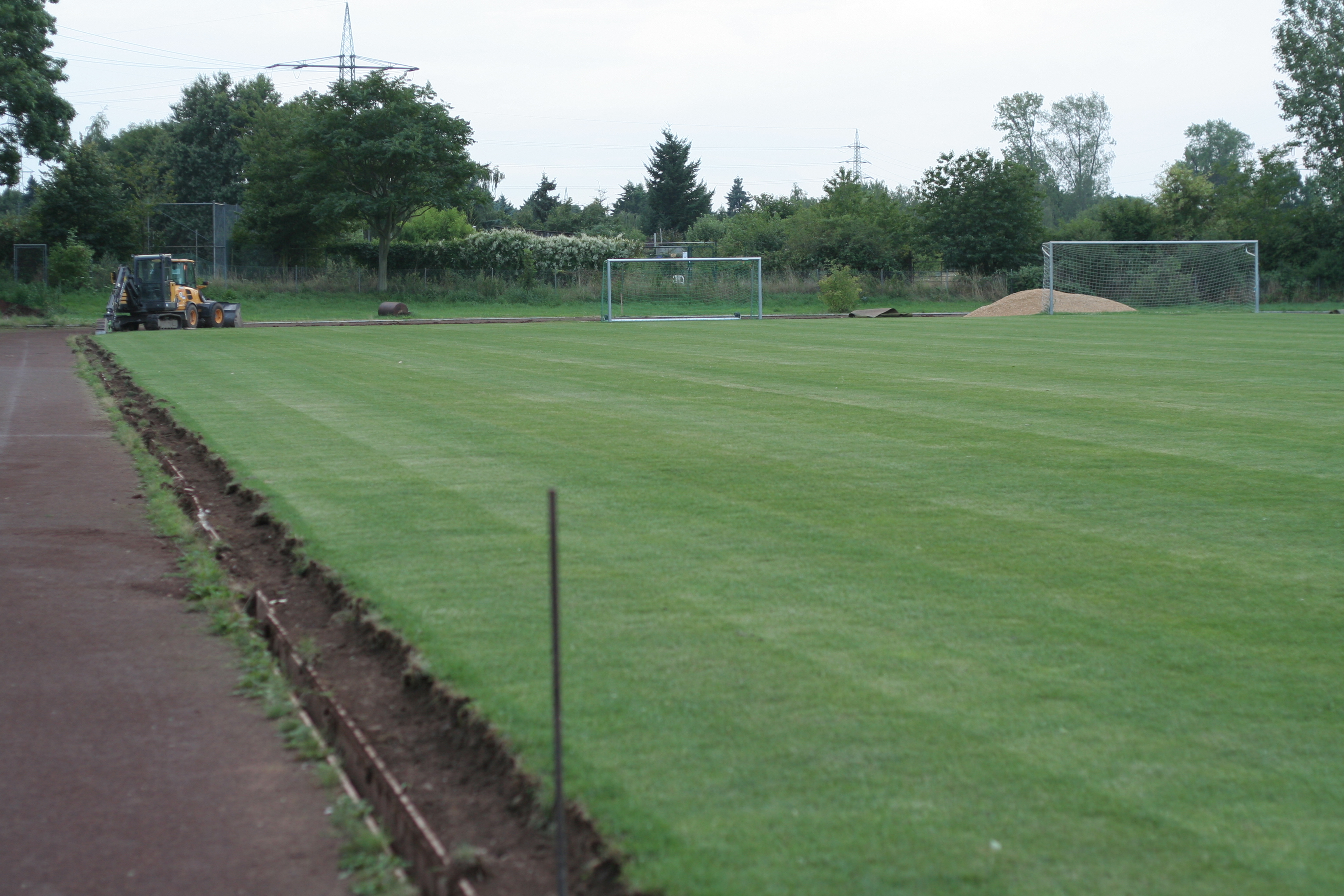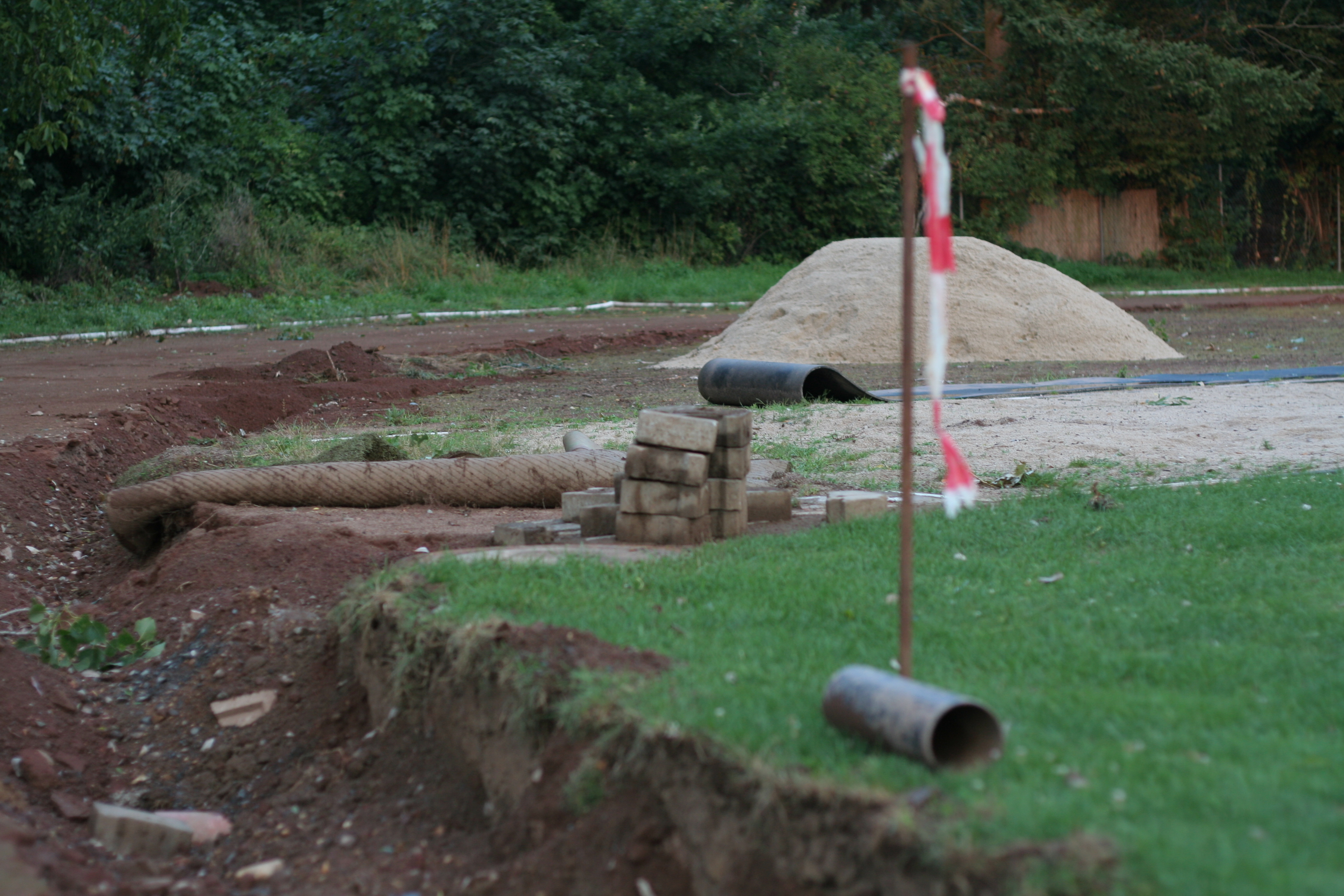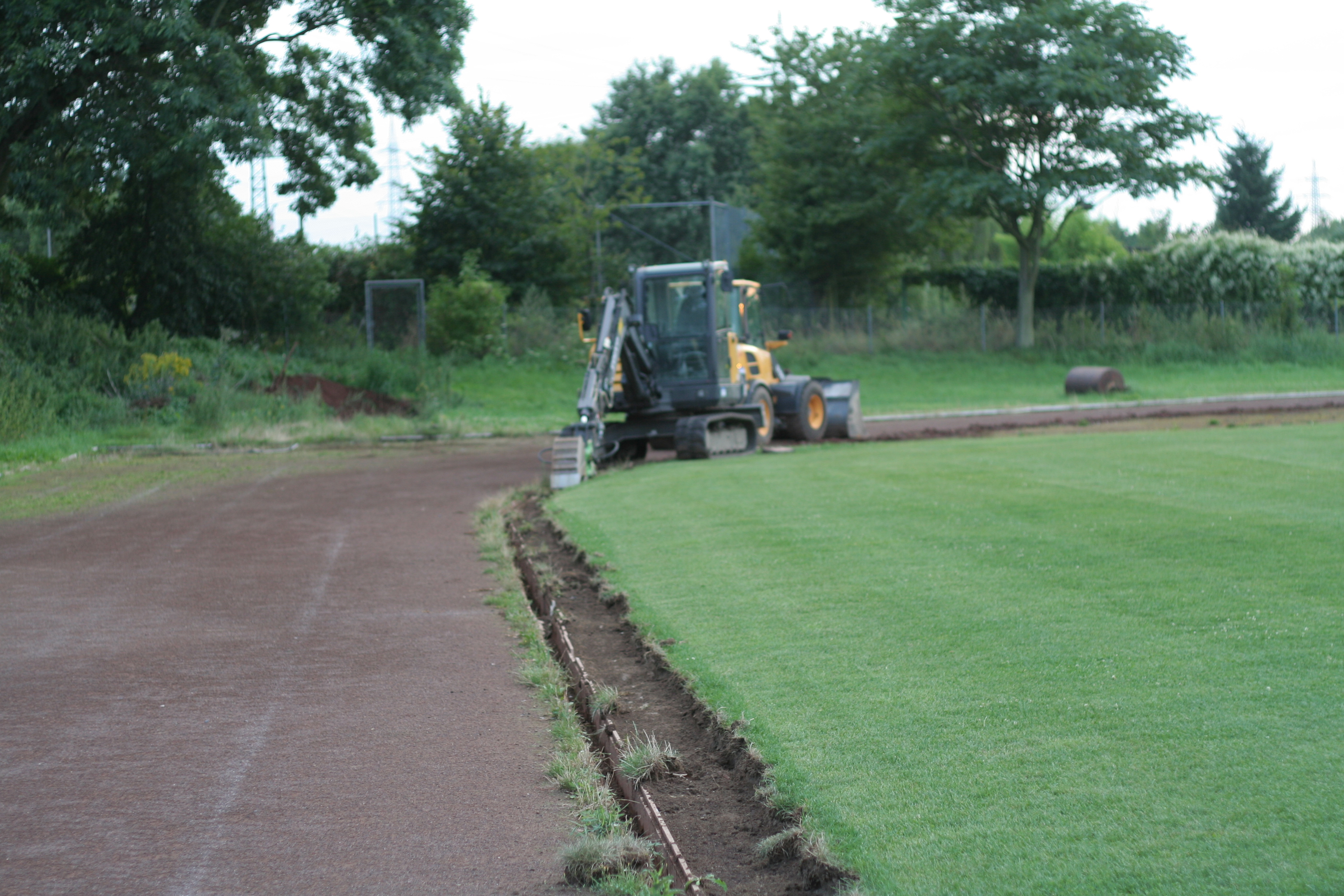Nachdem von Donnerstag bis Dienstag auf unserem Sportplatz nichts passiert ist, geht es seit Mittwoch wieder weiter. Die alte Drainage in den Kurven ist ausgegraben, an einer der Längsseiten wurde nicht nur der Rasen abgetragen sondern ein Graben gebuddelt.