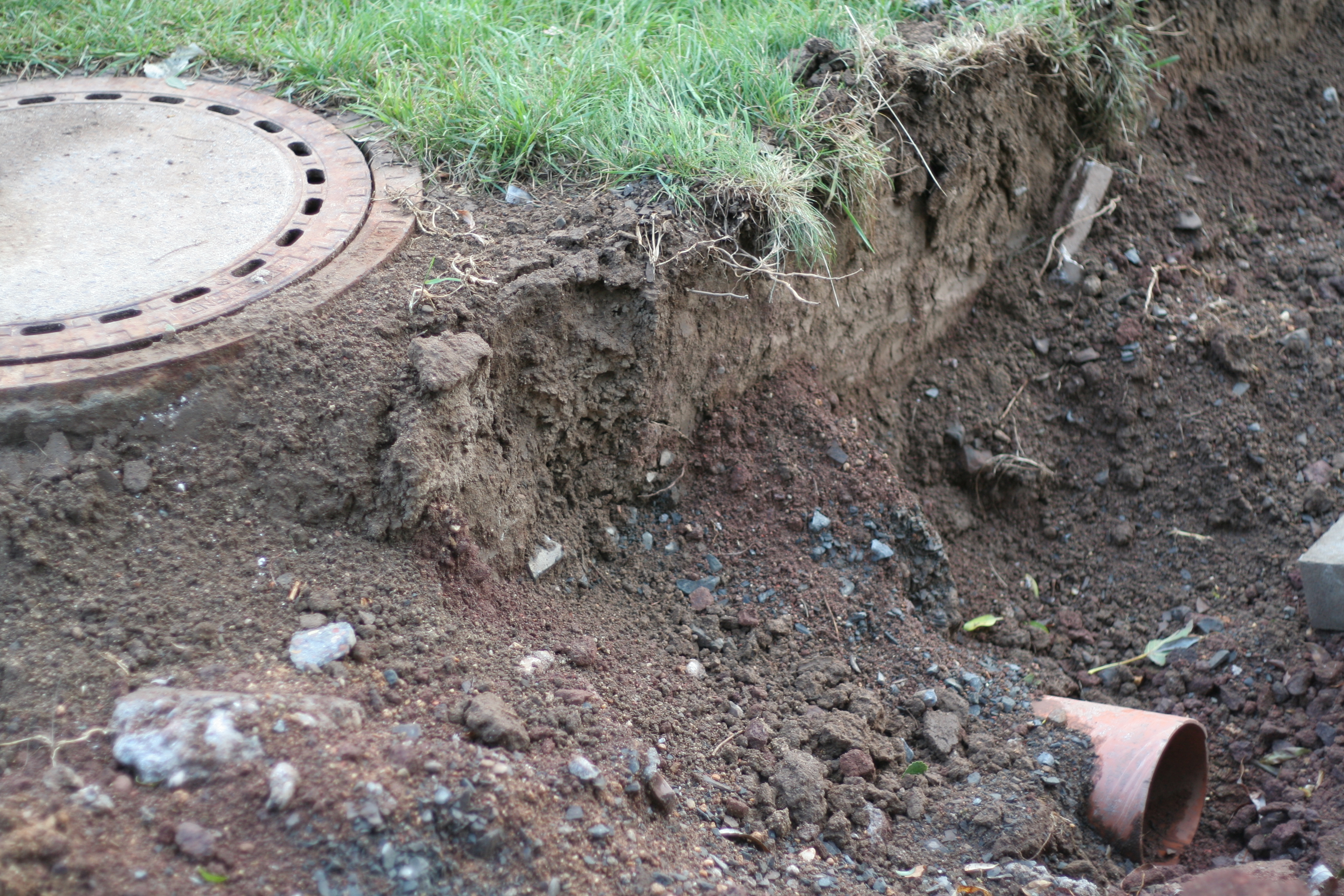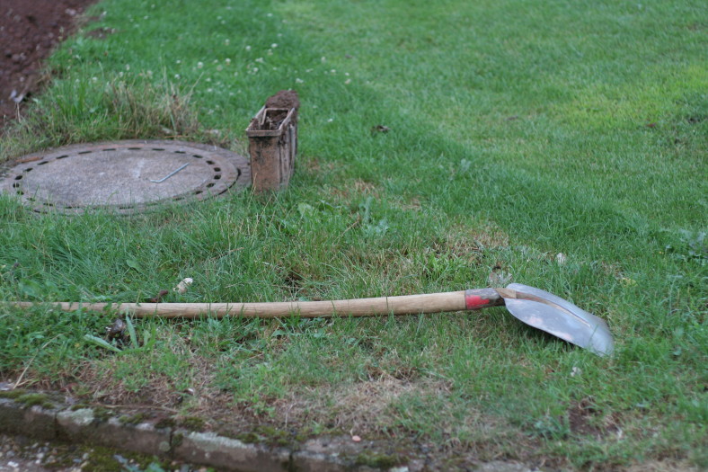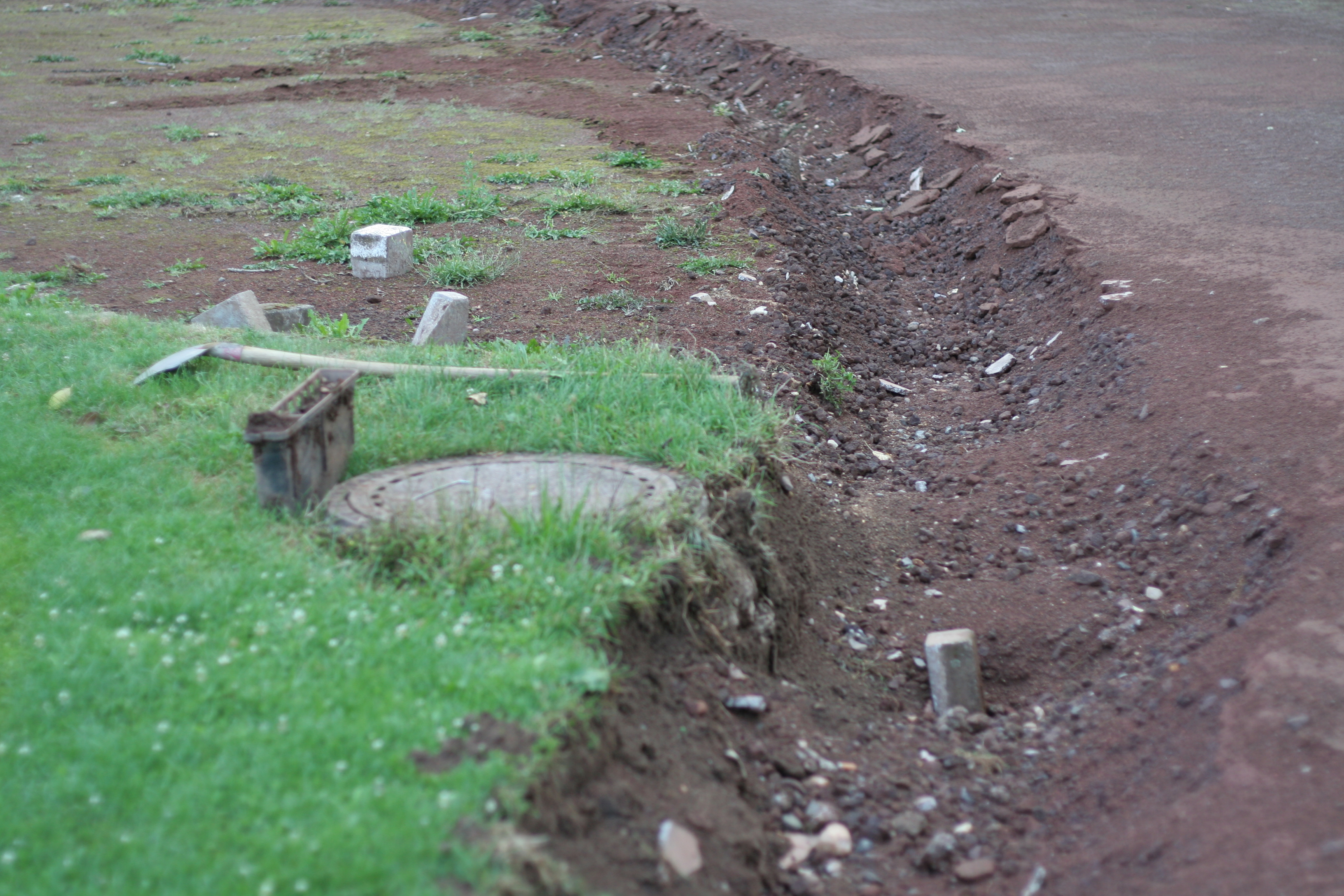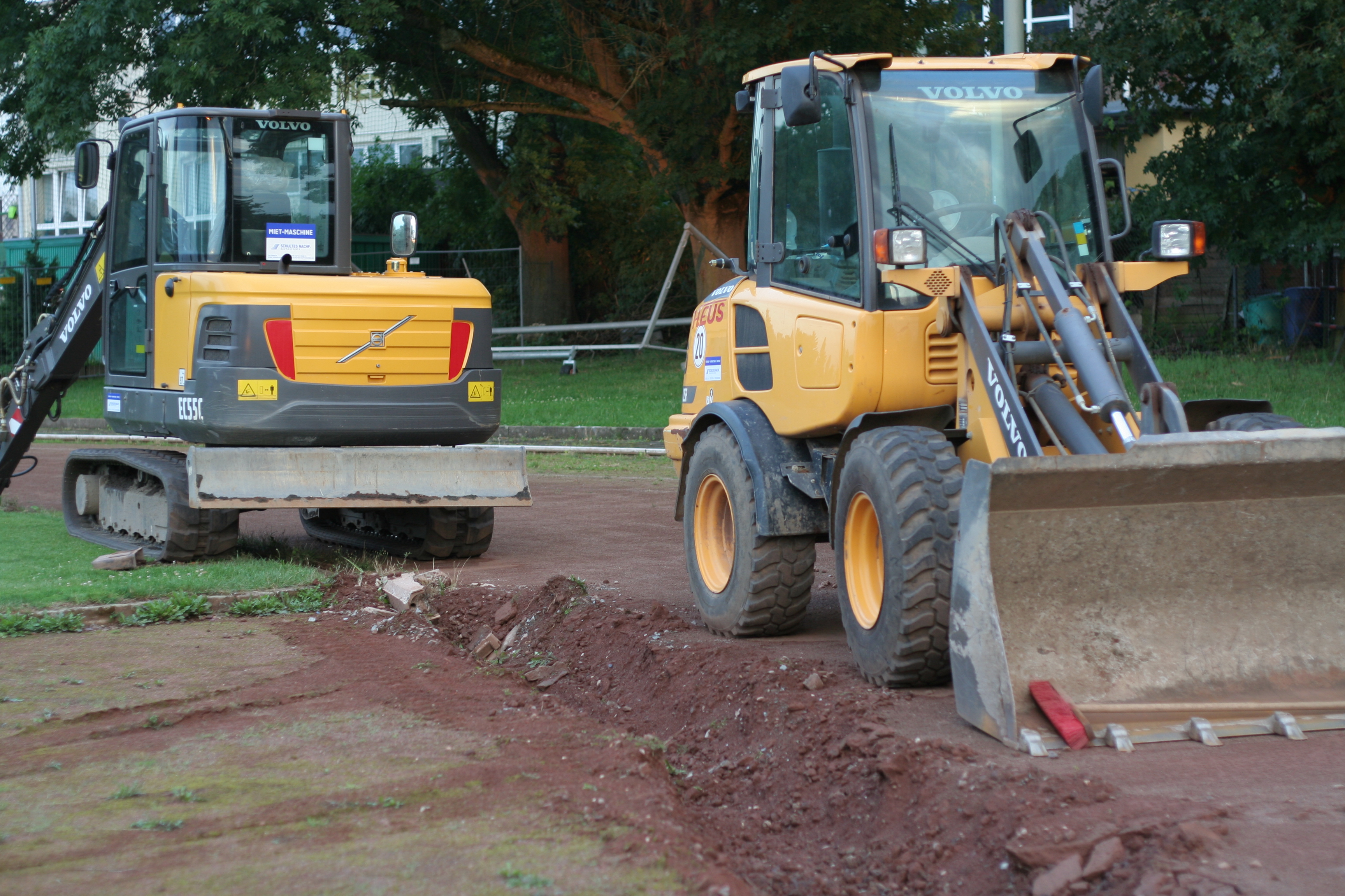 Nachdem von Donnerstag bis Dienstag auf unserem Sportplatz nichts passiert ist, geht es seit Mittwoch wieder weiter. Die alte Drainage in den Kurven ist ausgegraben, an einer der Längsseiten wurde nicht nur der Rasen abgetragen sondern ein Graben gebuddelt.