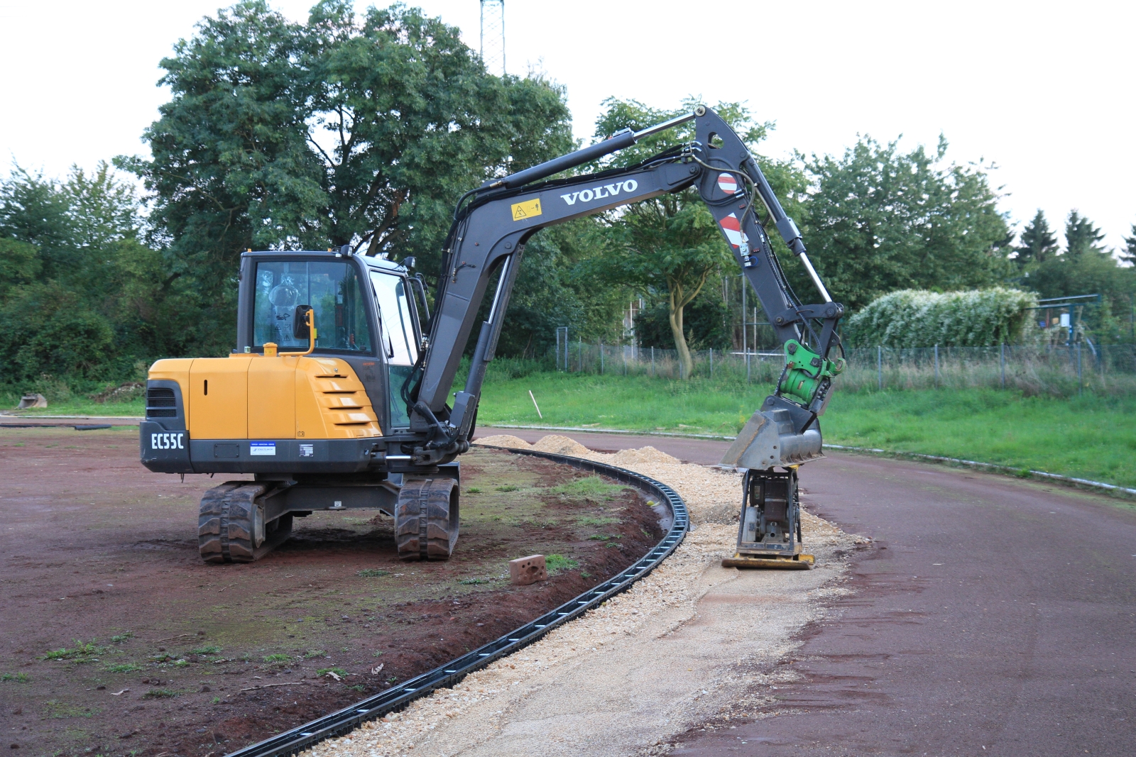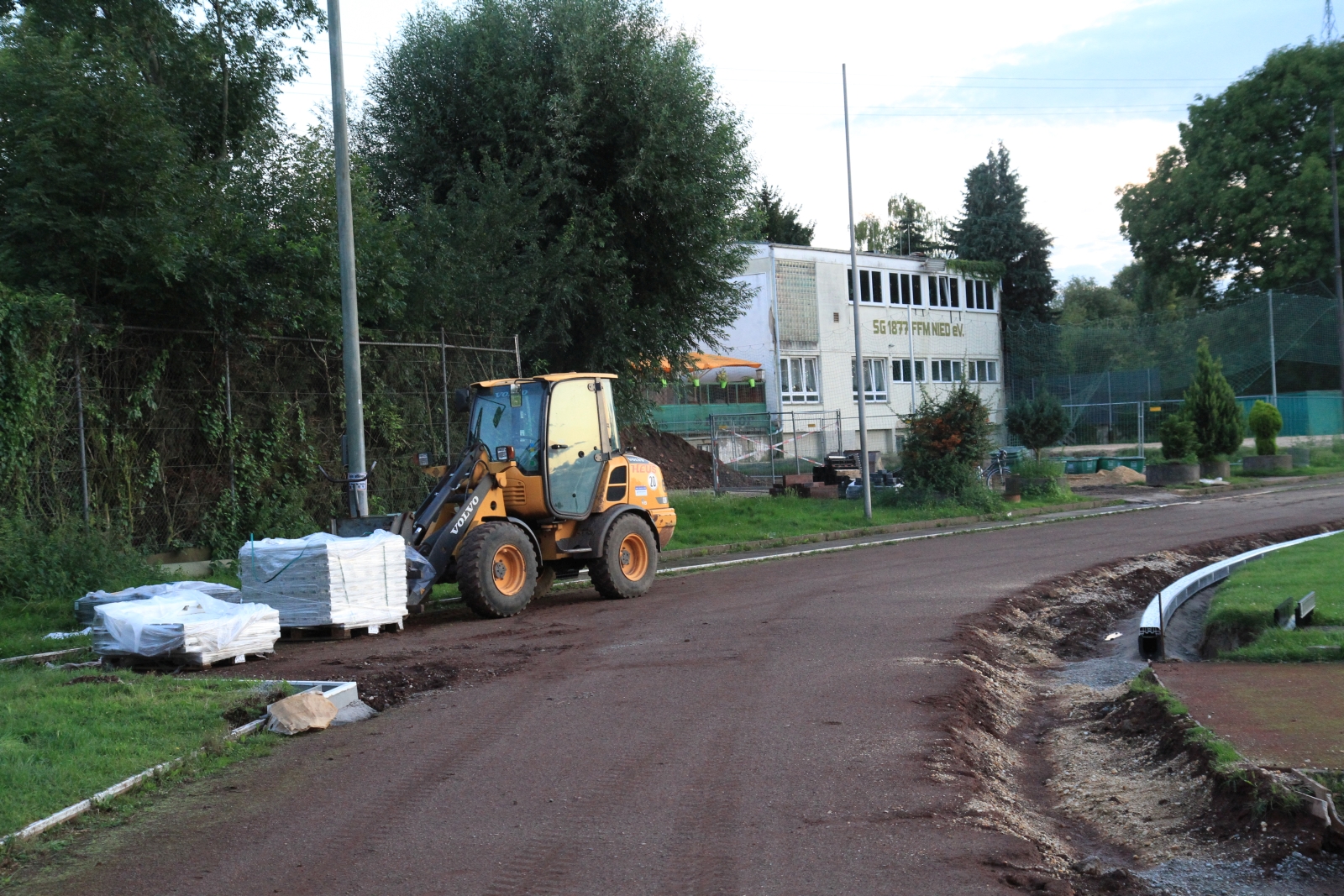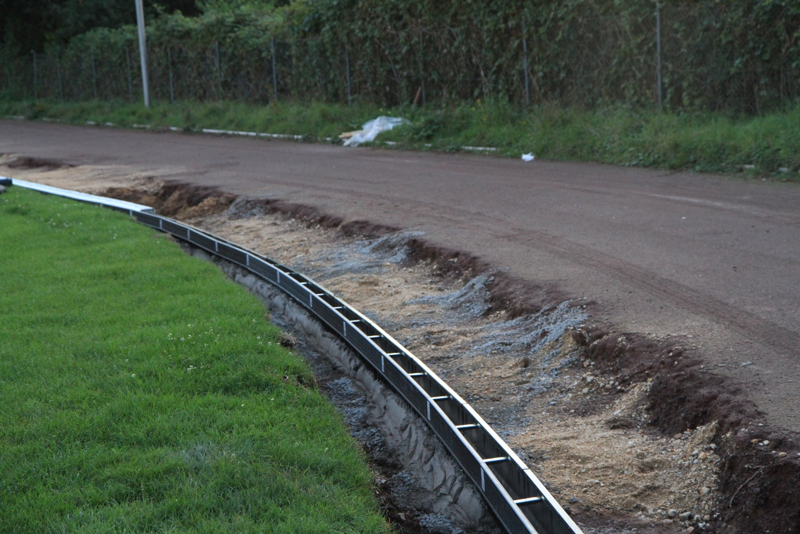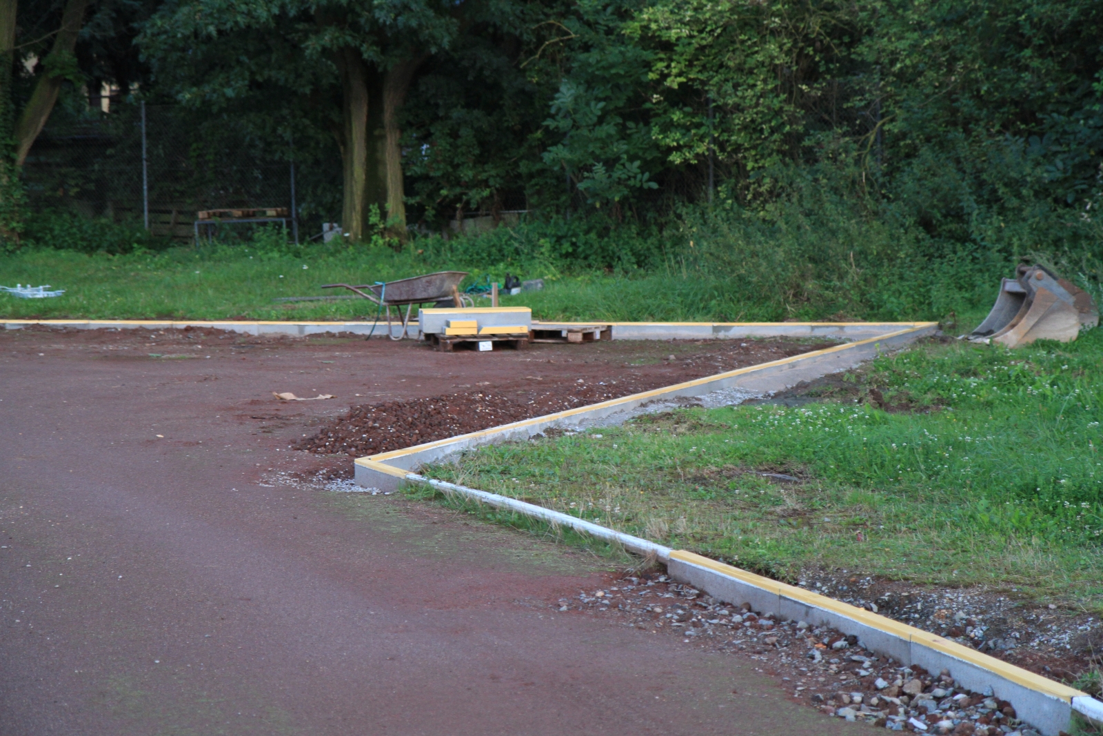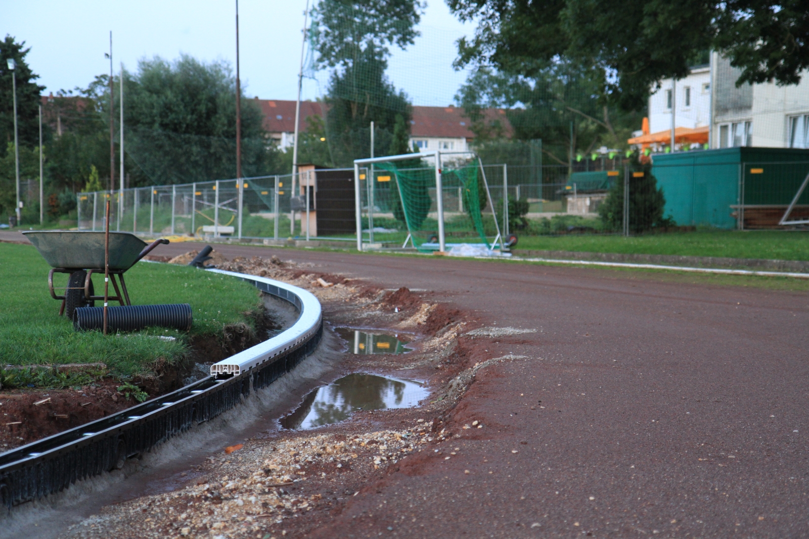 Teile der Rinne sind fertig und werden wieder zugeschüttet. Einige Verbindungen zur Drainage fehlen immer noch. Von einer Erneuerung der Aschenbahn und des Eingangsbereiches ist noch nichts zu sehen.