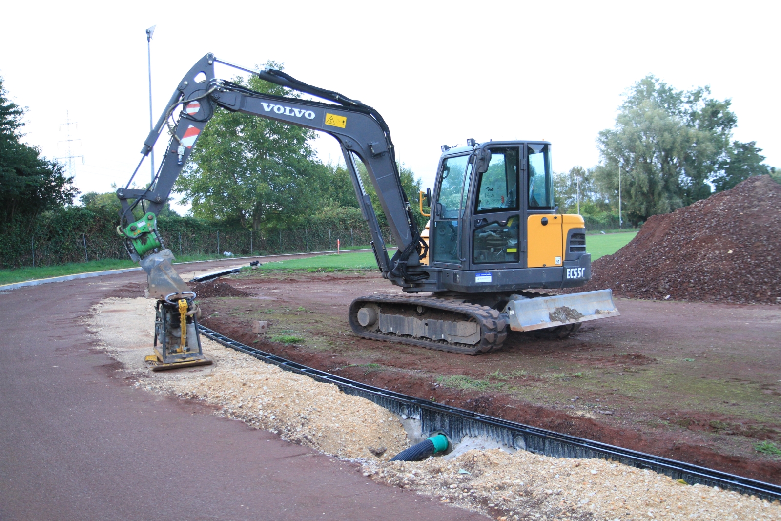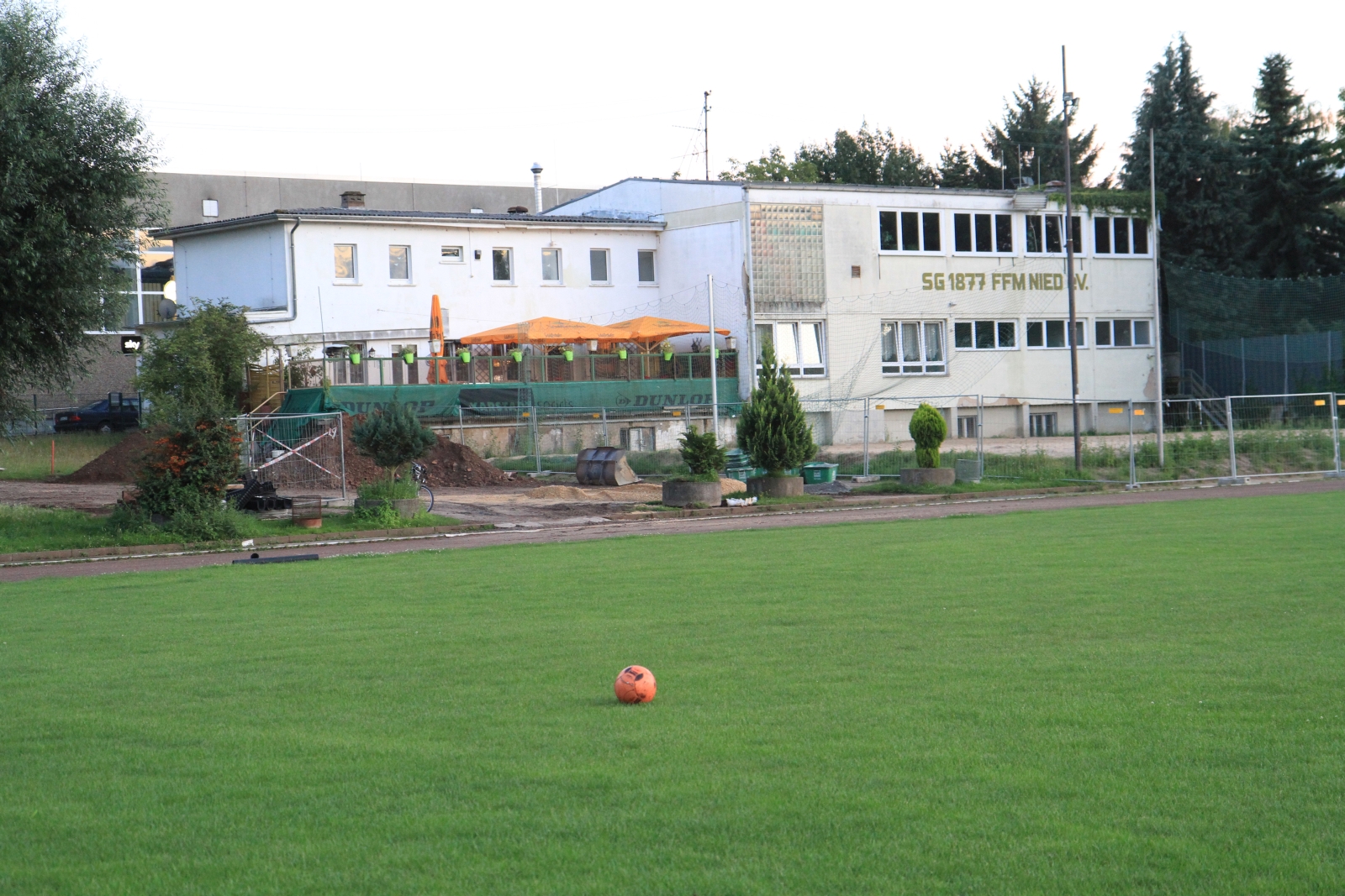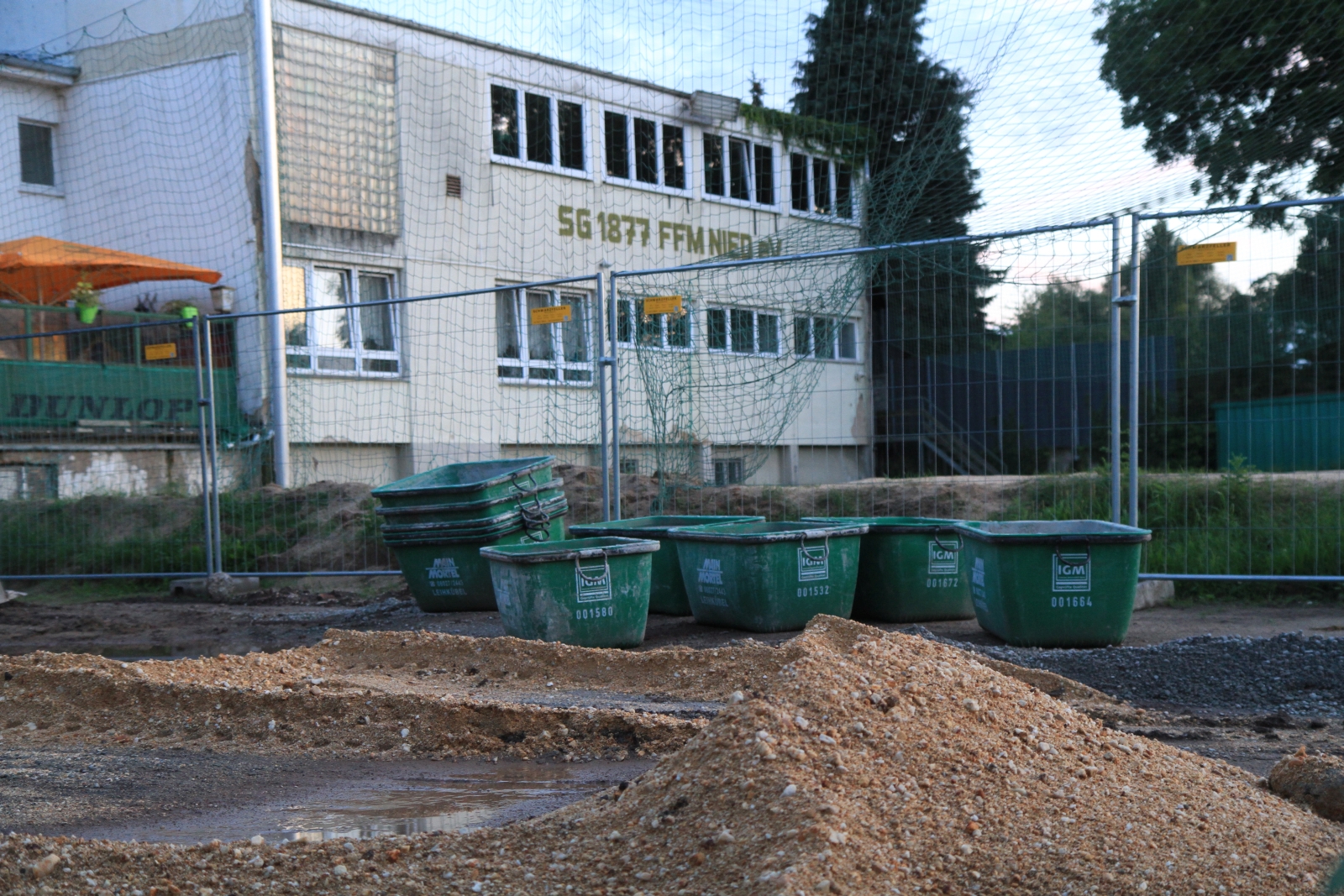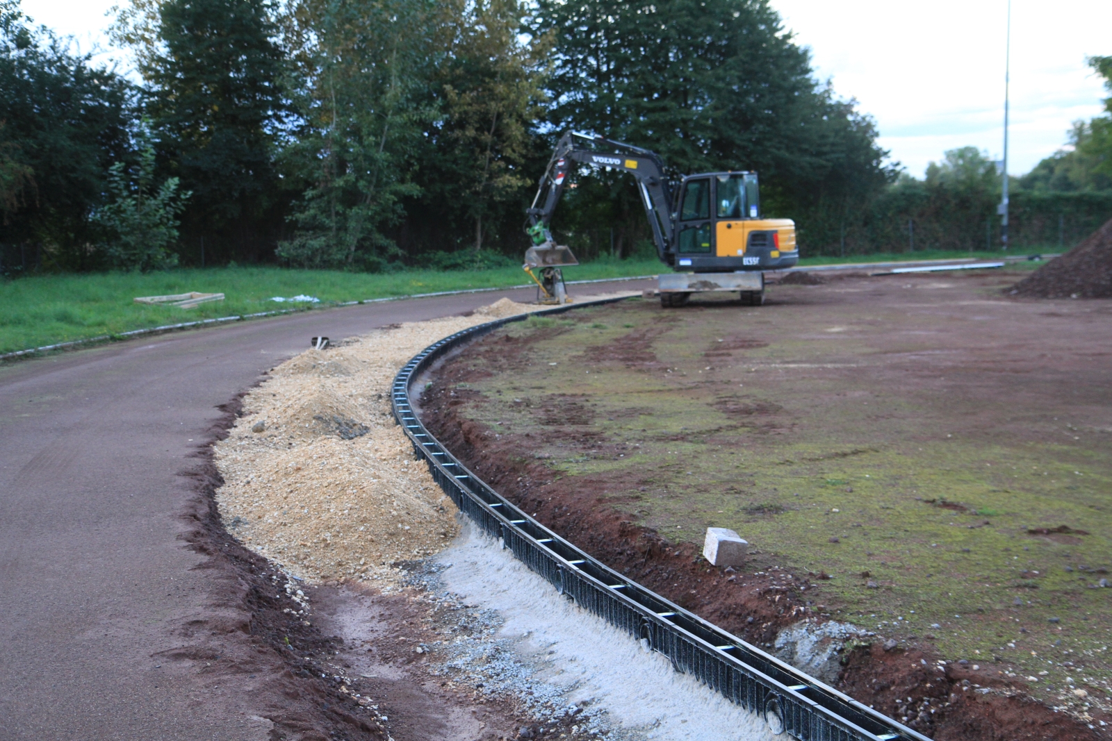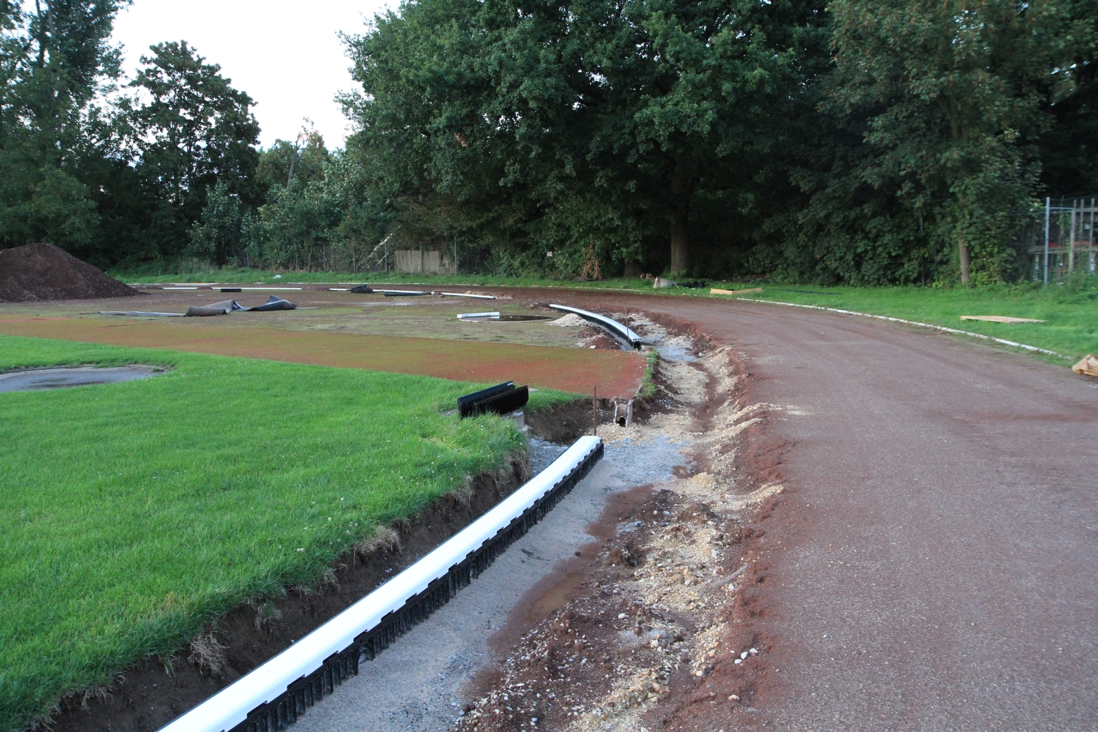 Teile der Rinne sind fertig und werden wieder zugeschüttet. Einige Verbindungen zur Drainage fehlen immer noch. Von einer Erneuerung der Aschenbahn und des Eingangsbereiches ist noch nichts zu sehen.