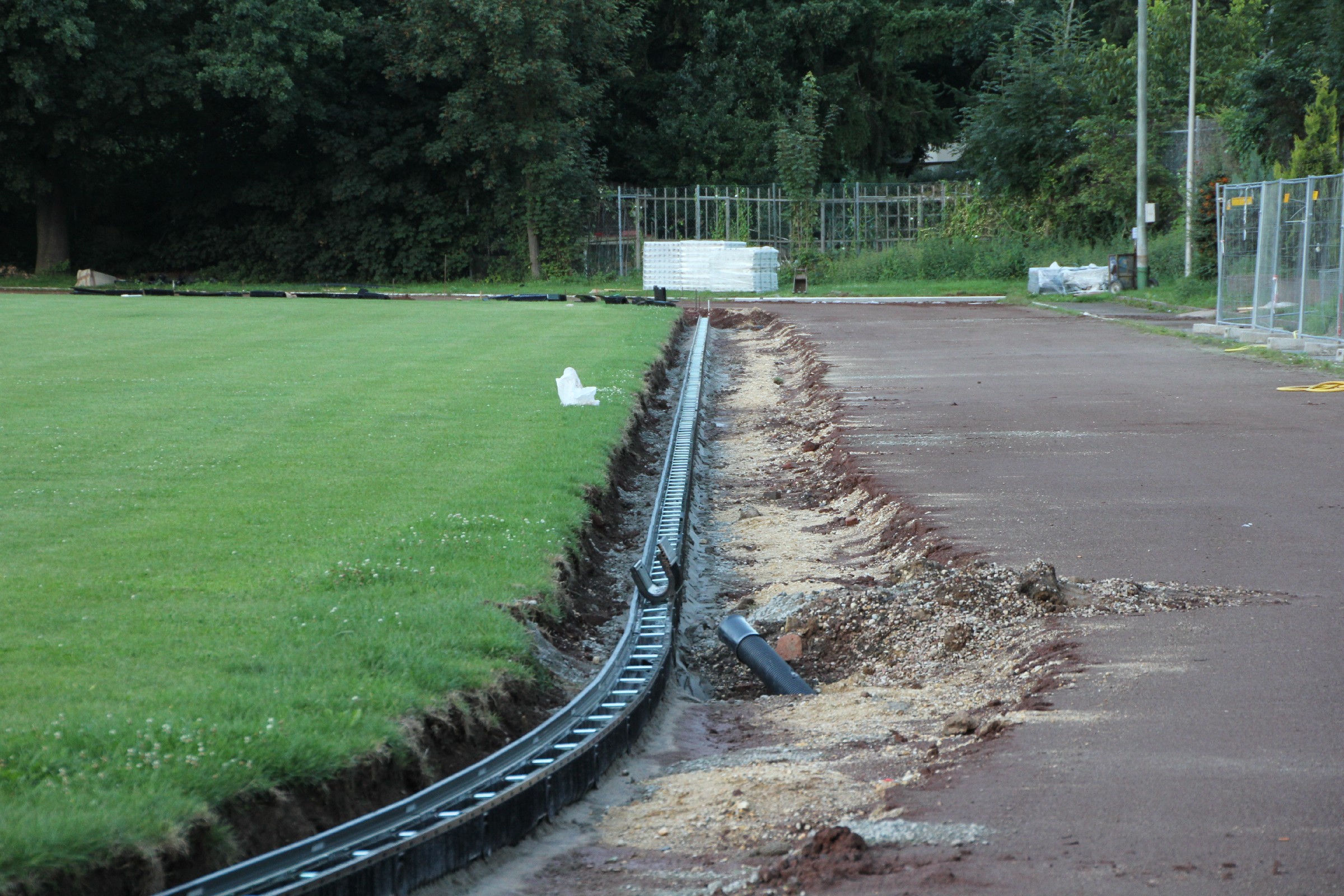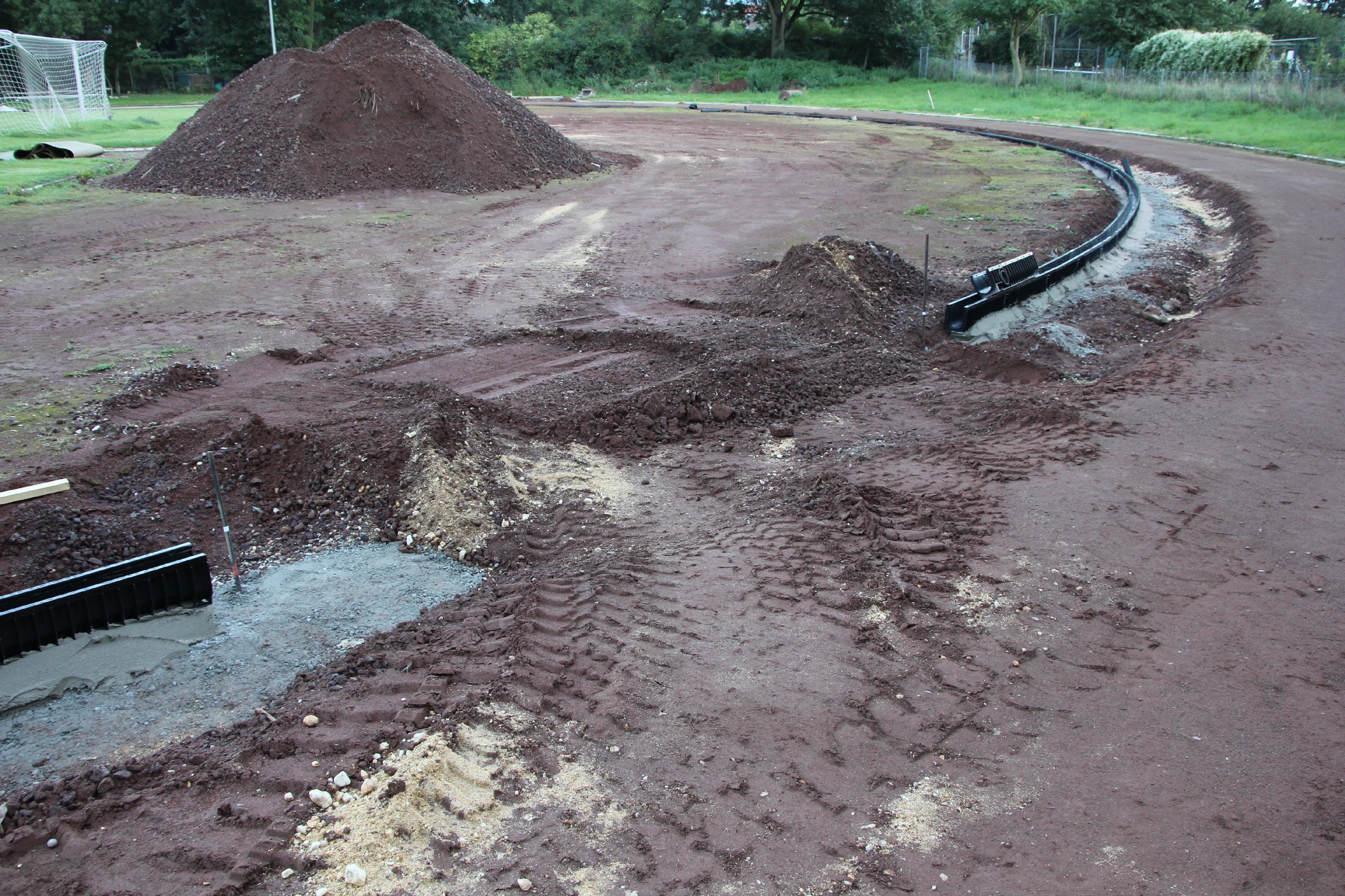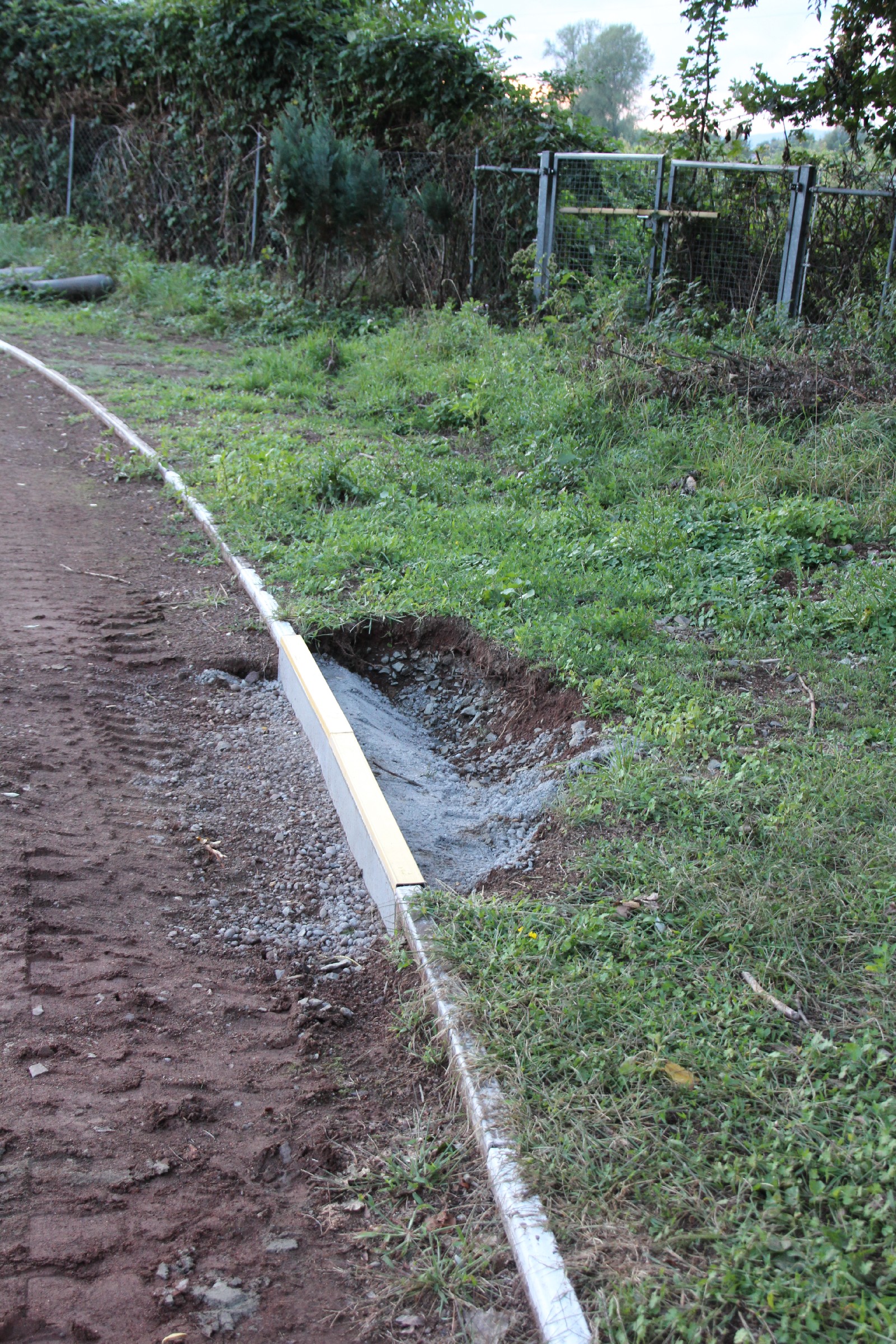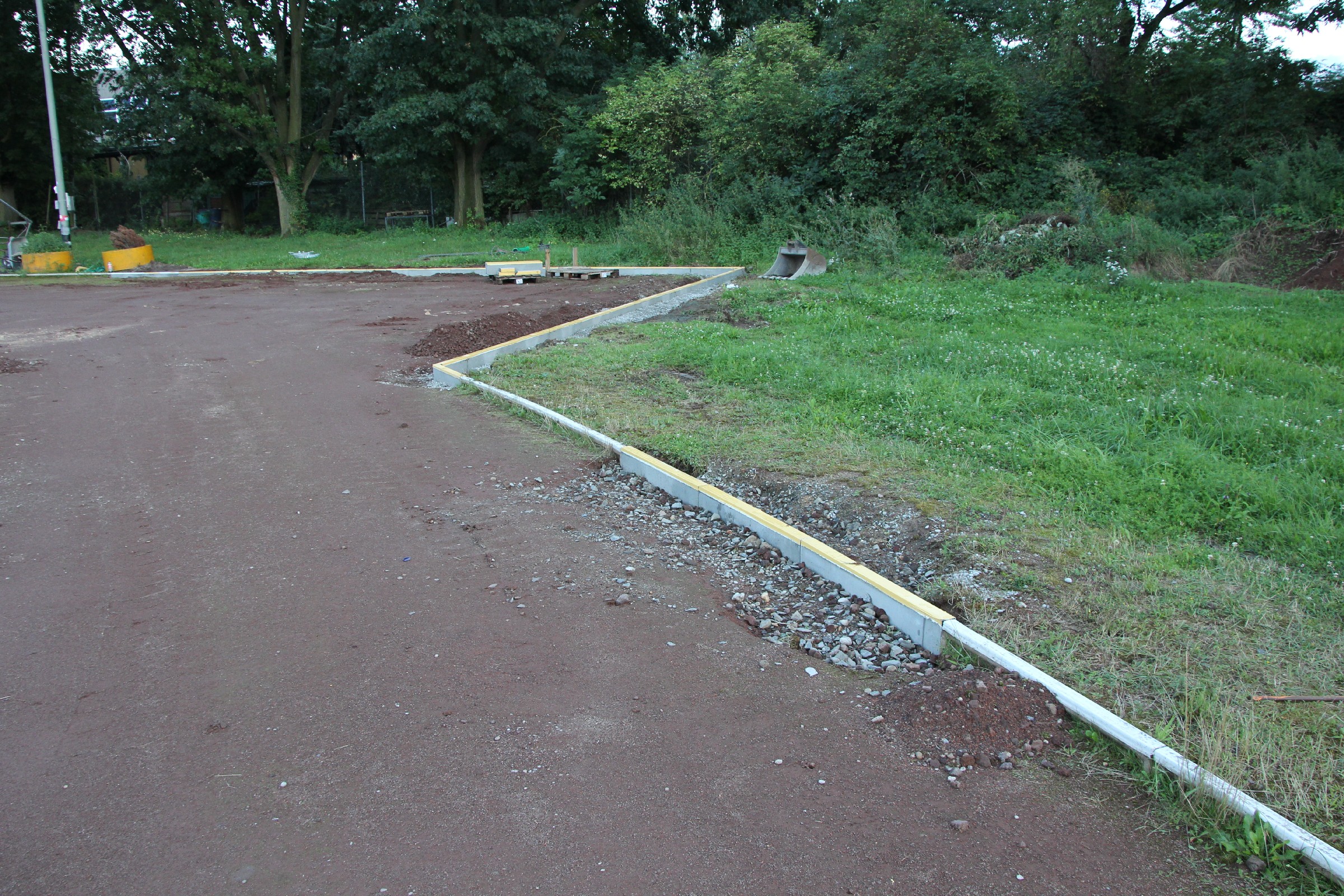 Die Kantsteine wurden an einigen kürzeren Stücken an der Nordseite und in den beiden Kurven ausgetauscht. Ferner wurde in der Südwestecke ein größeres Stück im Startbereich der 100 m-Bahn ausgetauscht. Die alten Kantsteine und ihre Fundamente bilden nun einen dritten Erdhaufen im Torbereich.