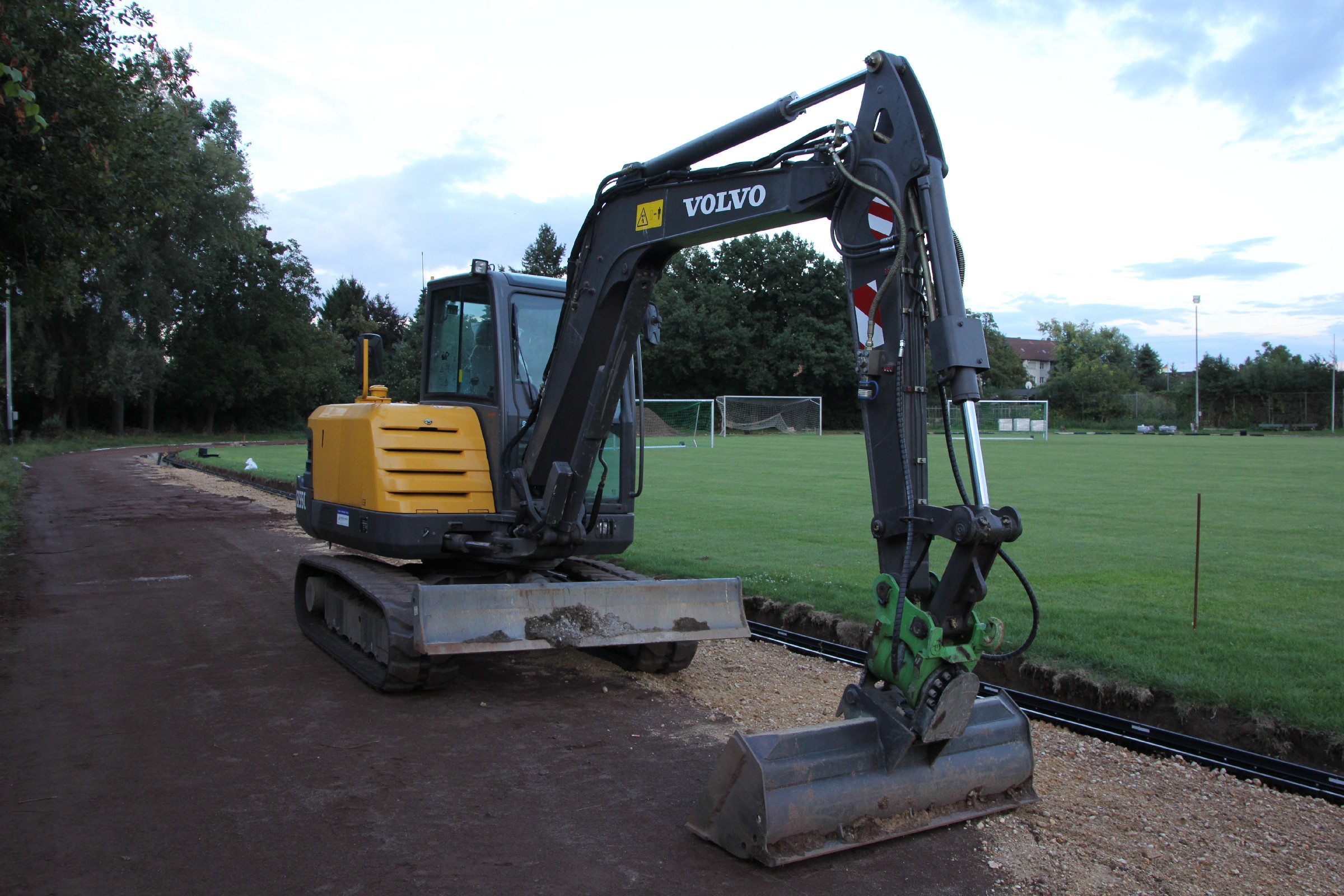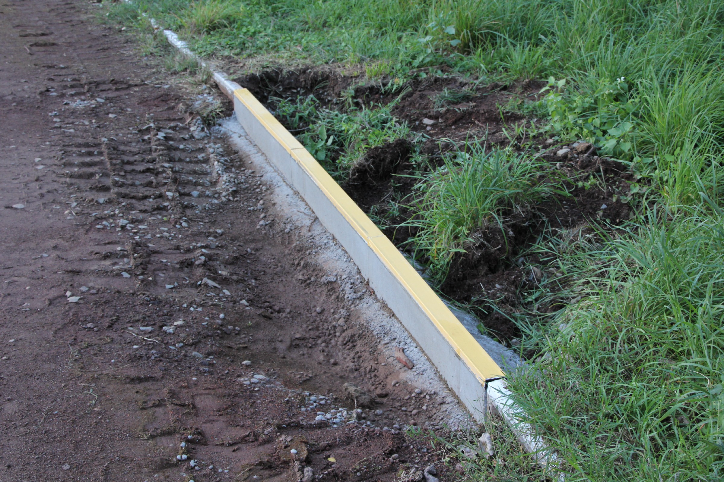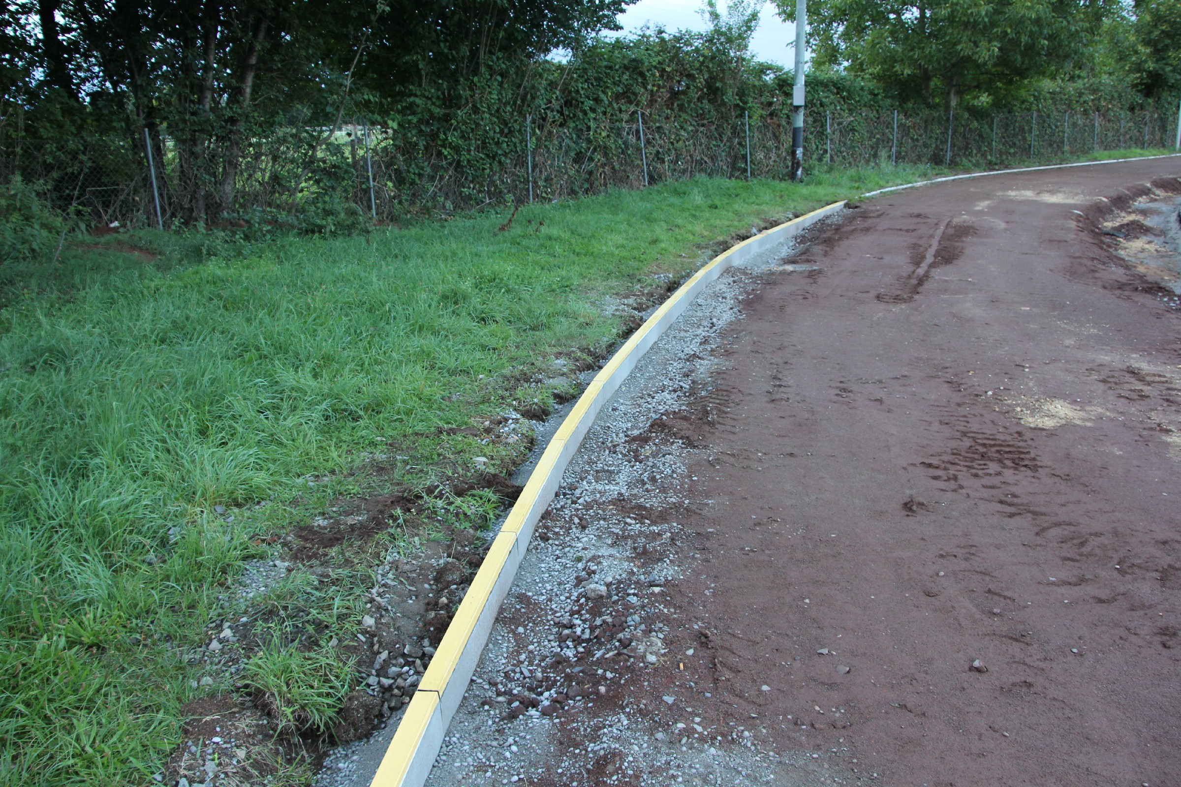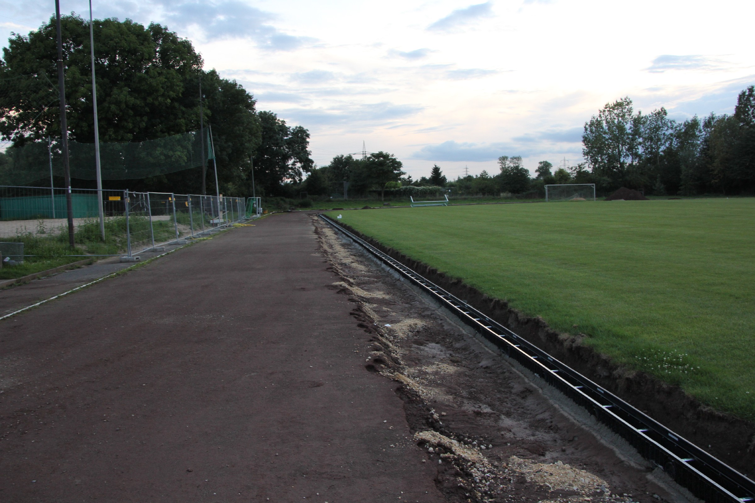 Die Kantsteine wurden an einigen kürzeren Stücken an der Nordseite und in den beiden Kurven ausgetauscht. Ferner wurde in der Südwestecke ein größeres Stück im Startbereich der 100 m-Bahn ausgetauscht. Die alten Kantsteine und ihre Fundamente bilden nun einen dritten Erdhaufen im Torbereich.