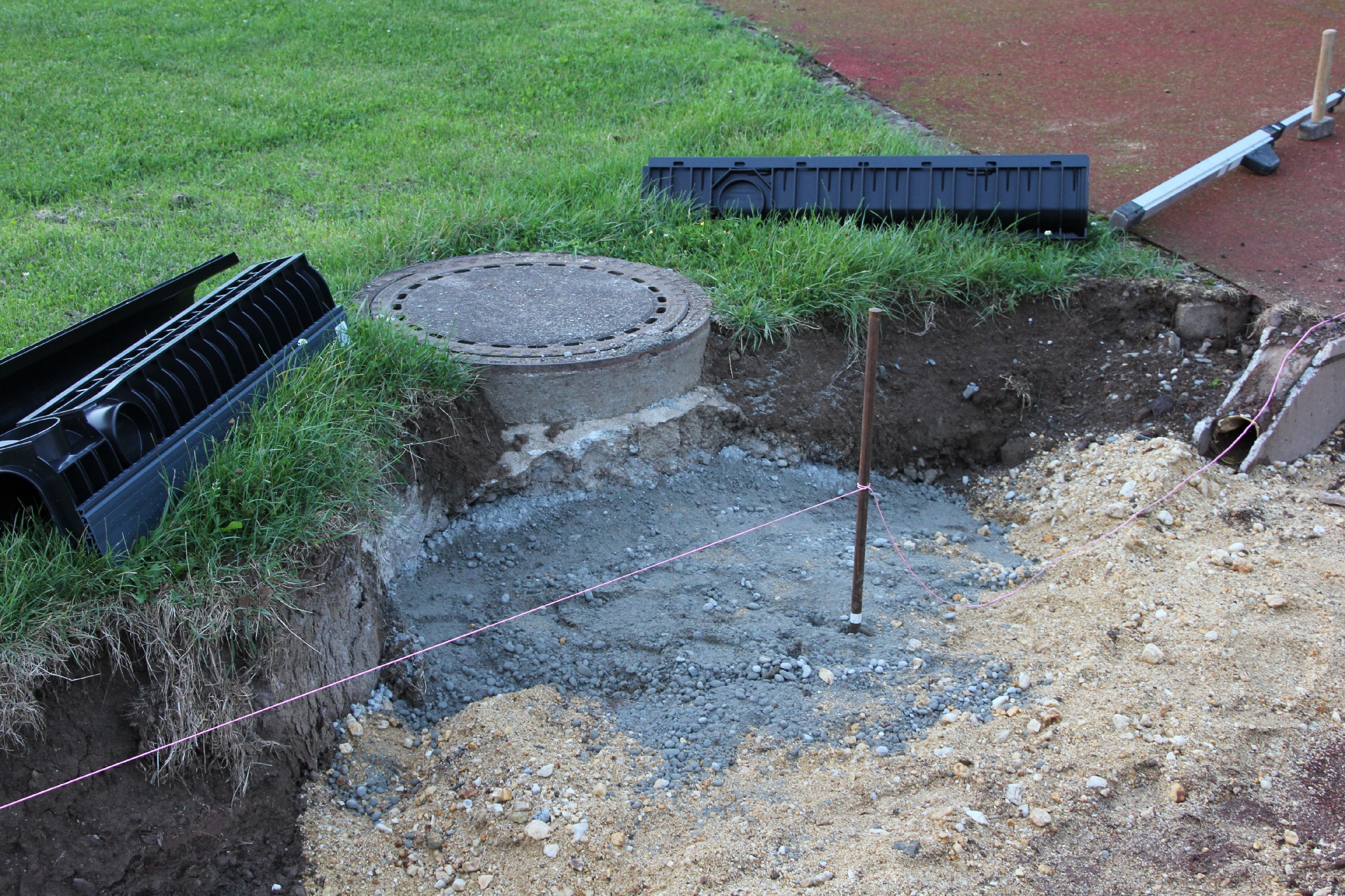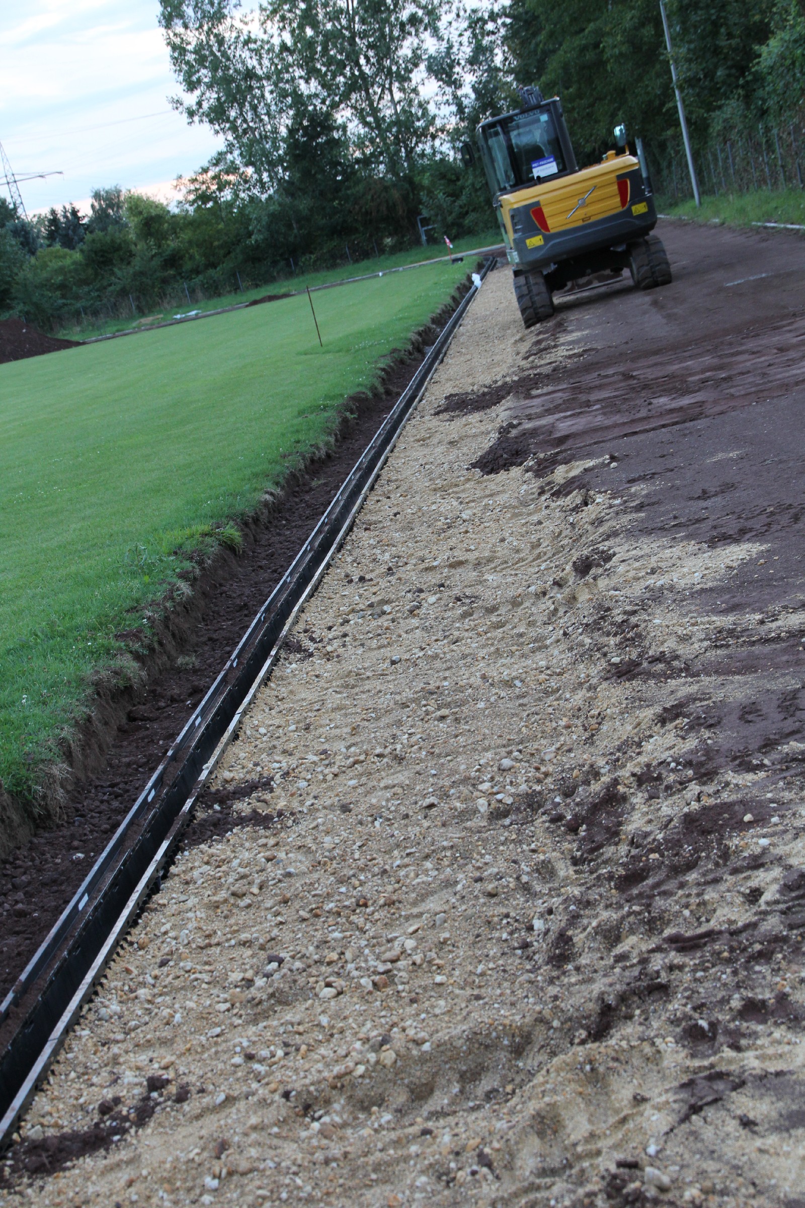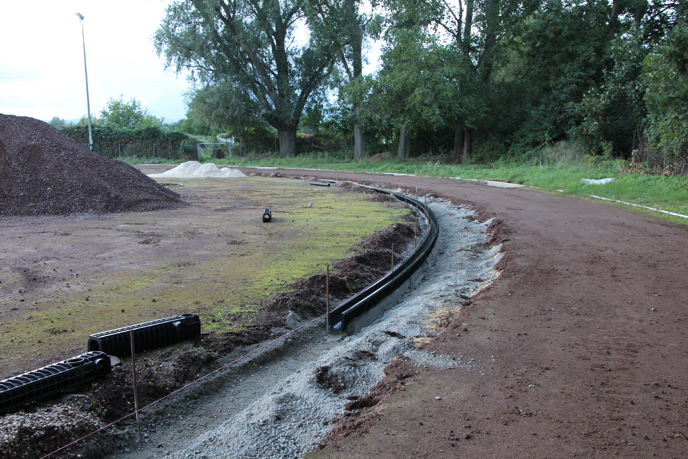 An der Innenseite der Aschenbahn gingen in den letzten Tagen die Arbeiten an der Rinne voran. An der Außenseite wurden defekte Kantsteine erneuert.