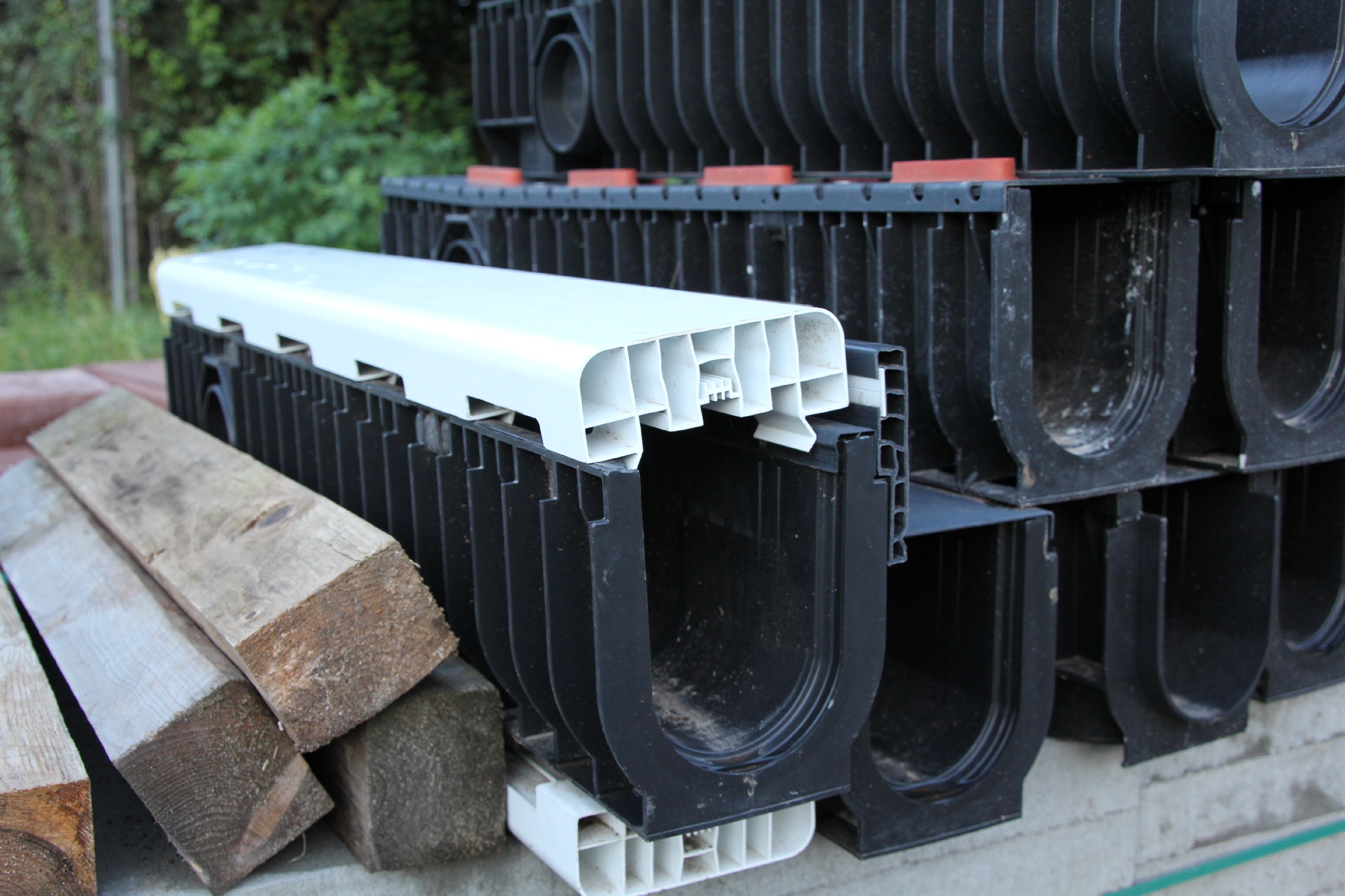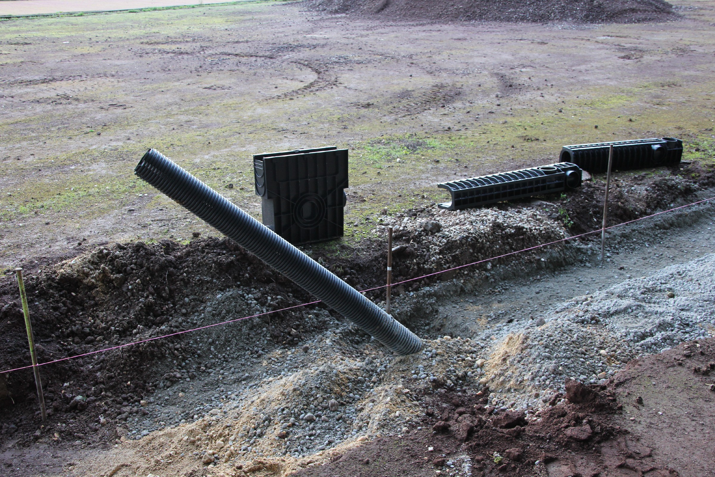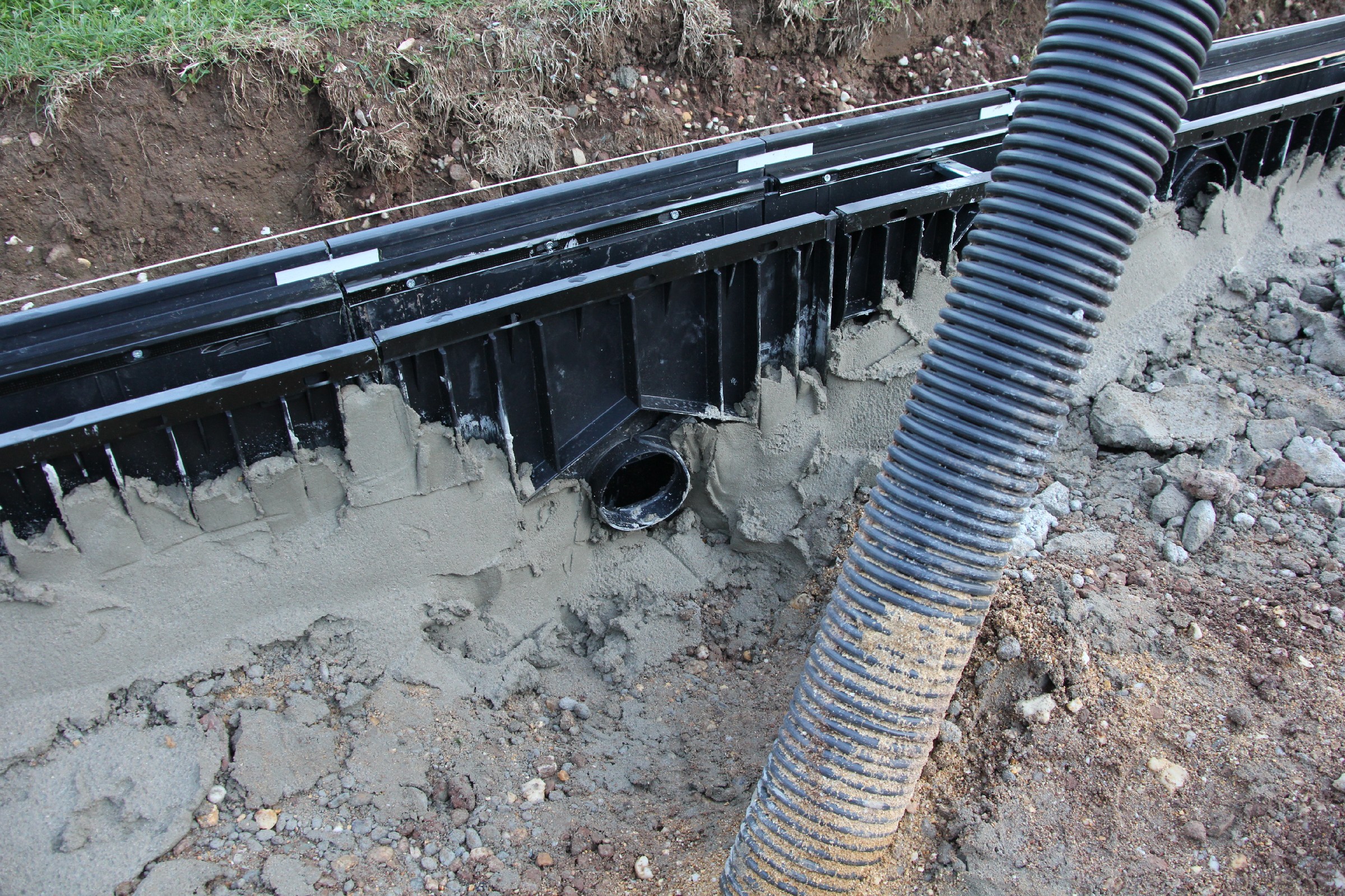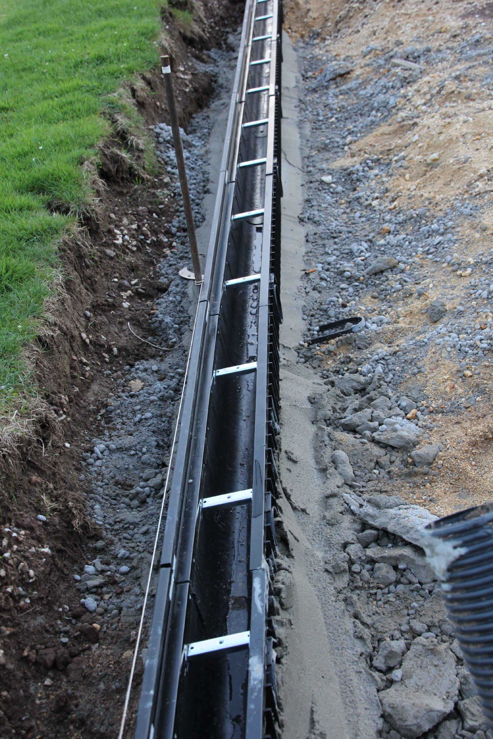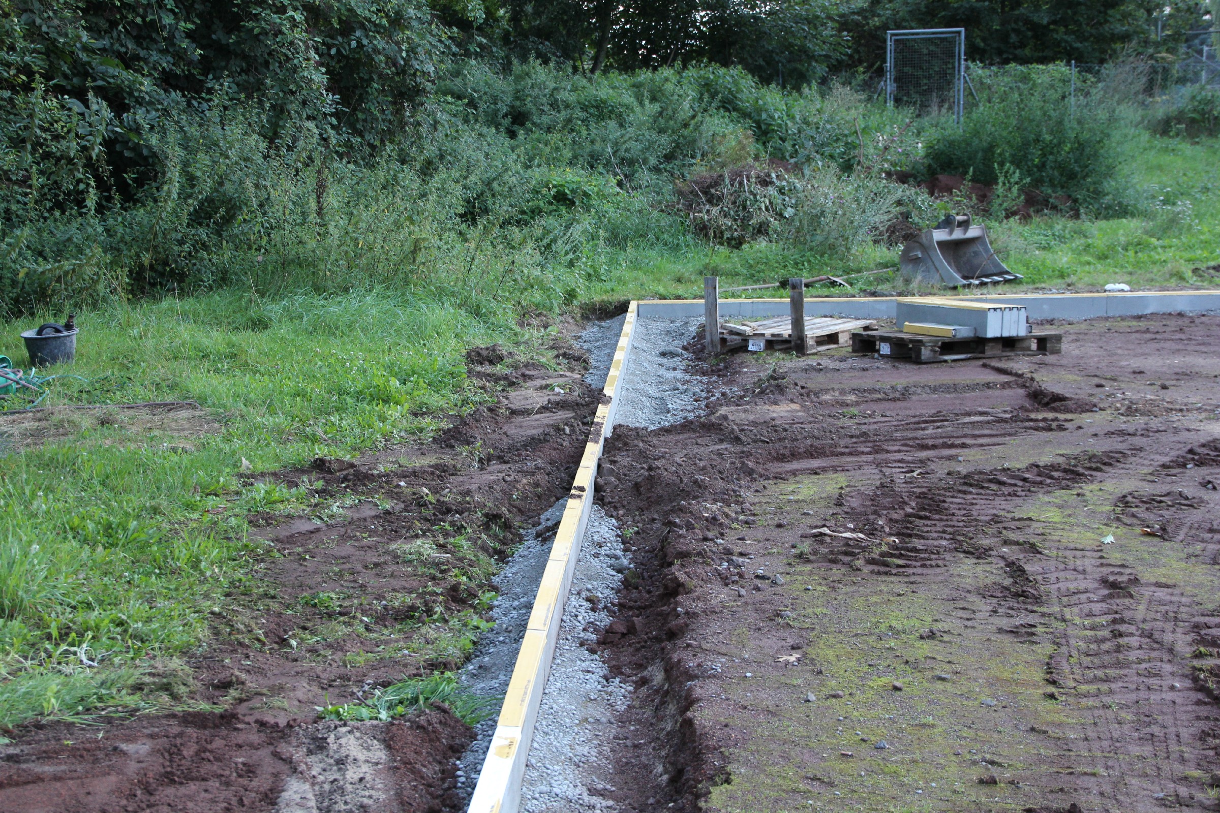 Die Rinne wurde weitestgehend fertiggestellt. Nur noch an wenigen Stellen sind Lücken zu schließen. Der Anschluss an die Drainage ist noch nicht überall erfolgt. Verbindungsstege, die die Rinne stabilisieren sollen, sind an der Hälfte der Rinnen bereits eingesetzt.