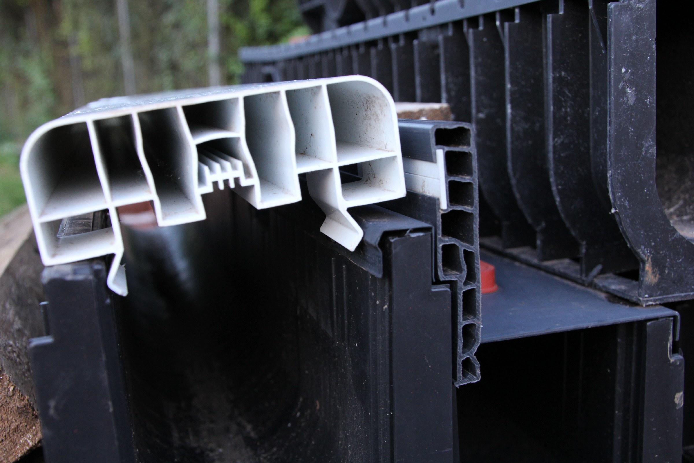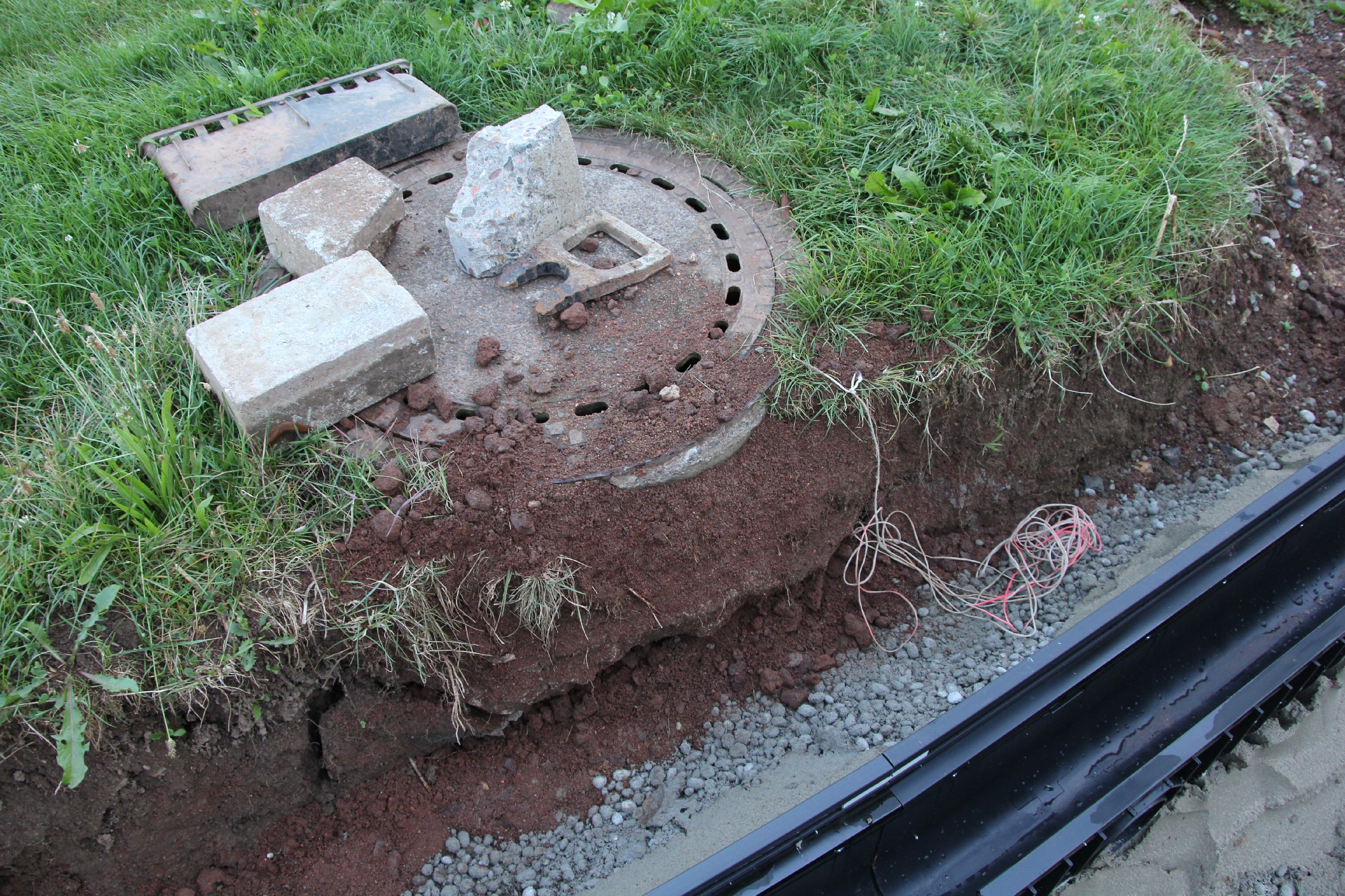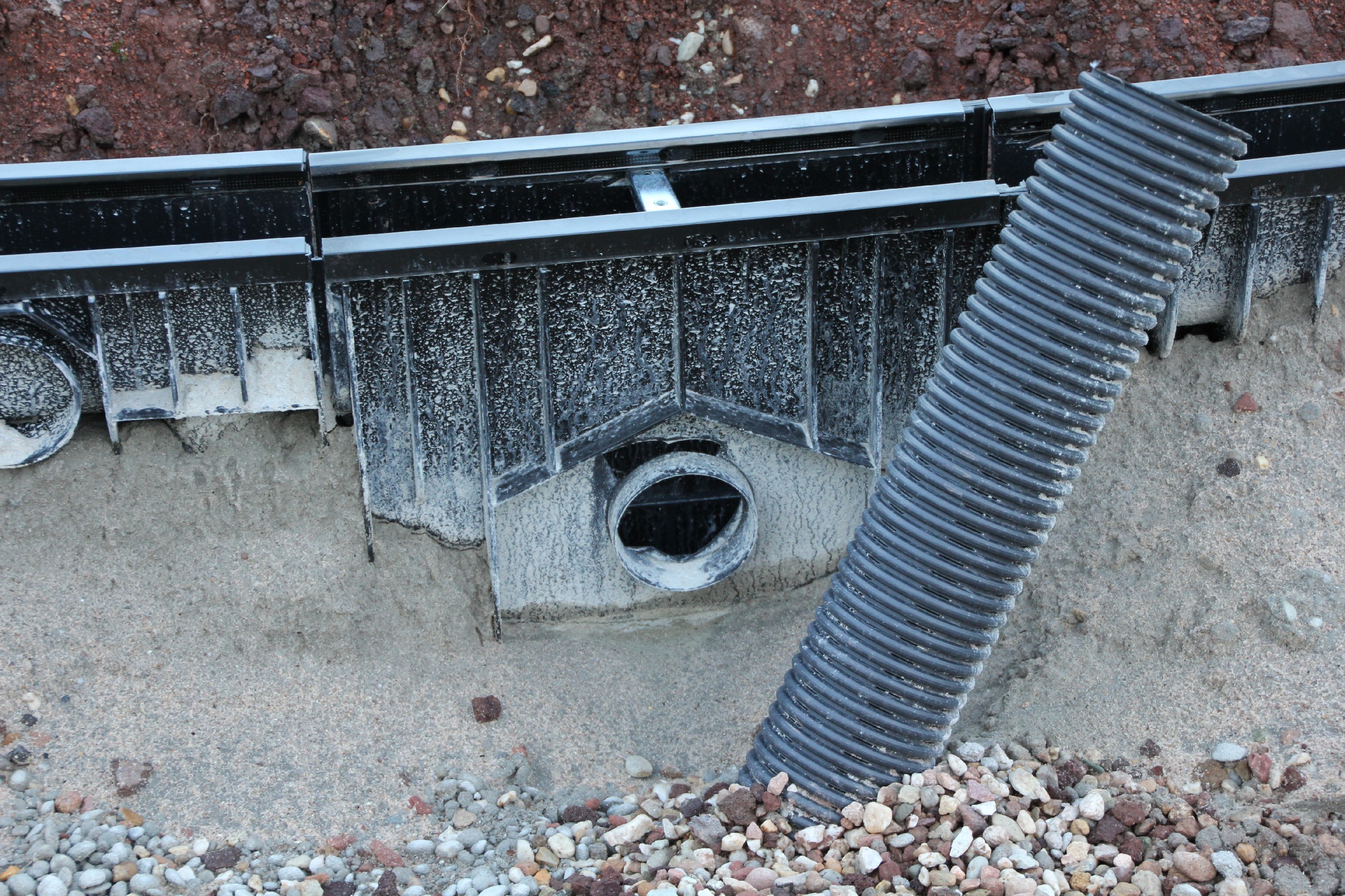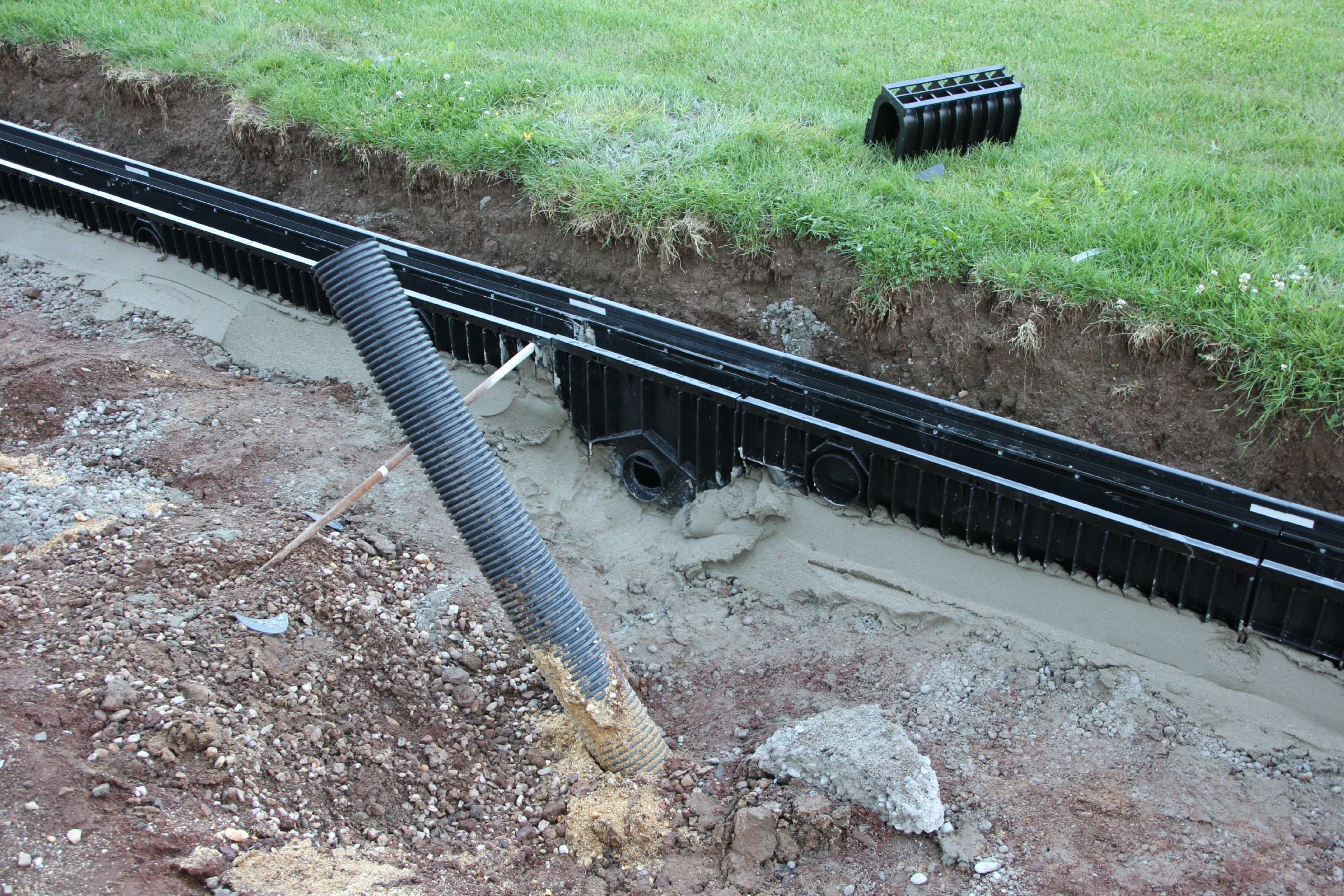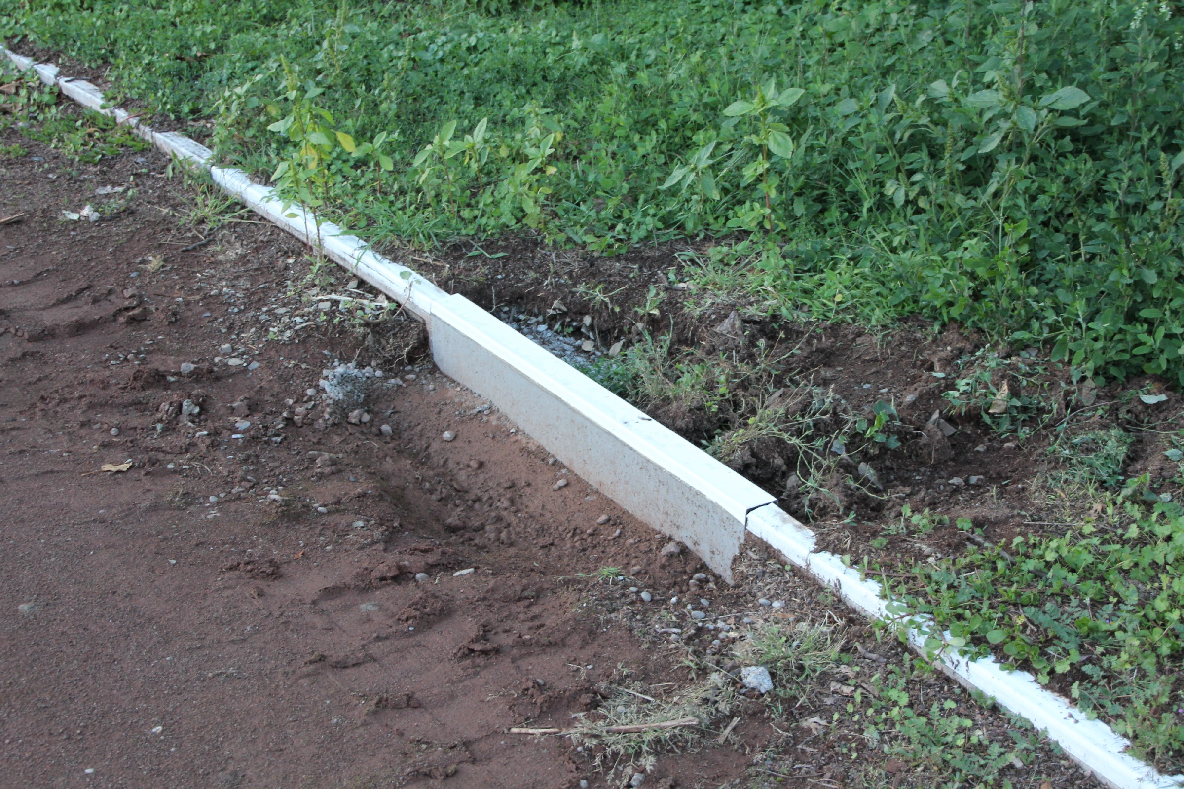 Die Rinne wurde weitestgehend fertiggestellt. Nur noch an wenigen Stellen sind Lücken zu schließen. Der Anschluss an die Drainage ist noch nicht überall erfolgt. Verbindungsstege, die die Rinne stabilisieren sollen, sind an der Hälfte der Rinnen bereits eingesetzt.