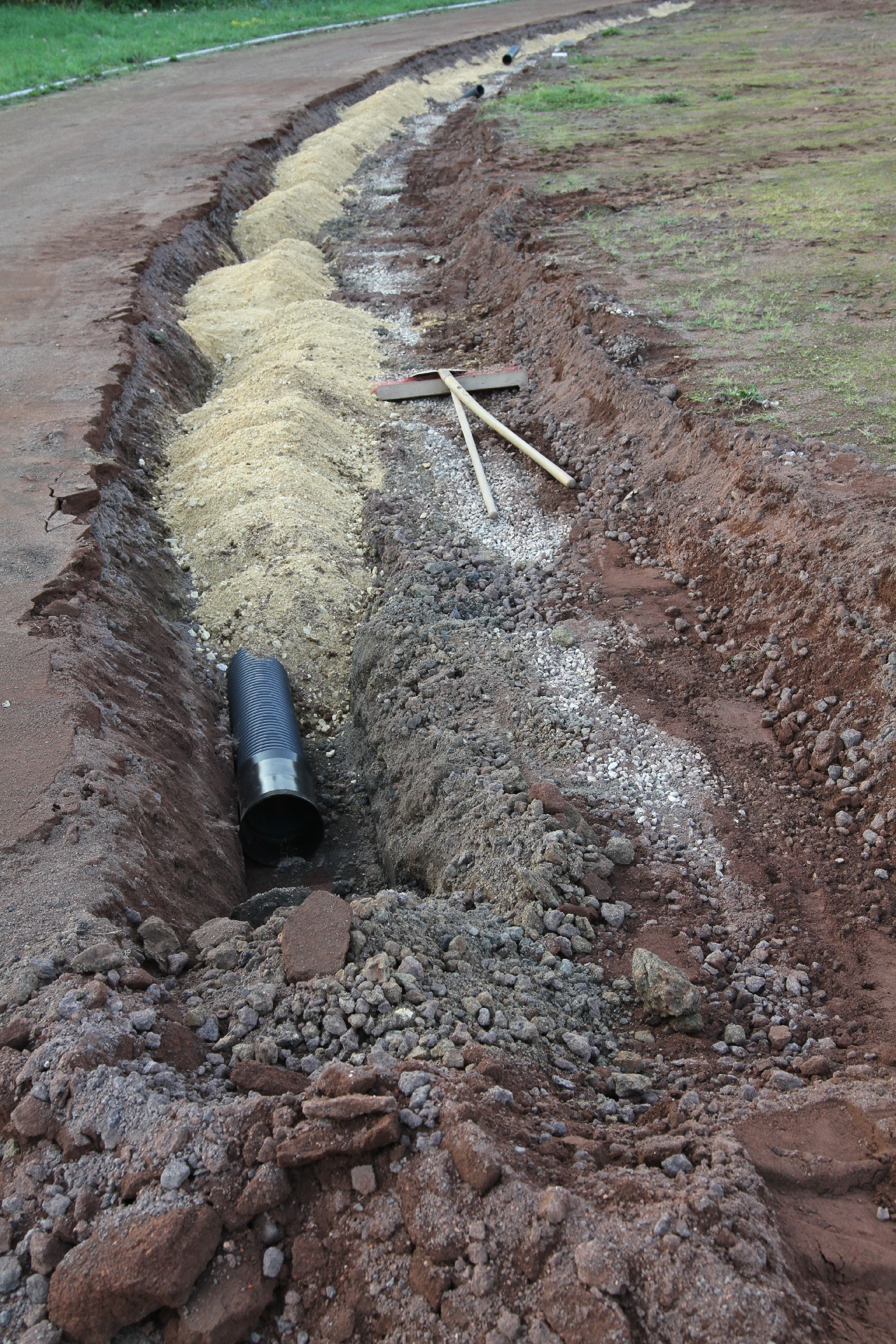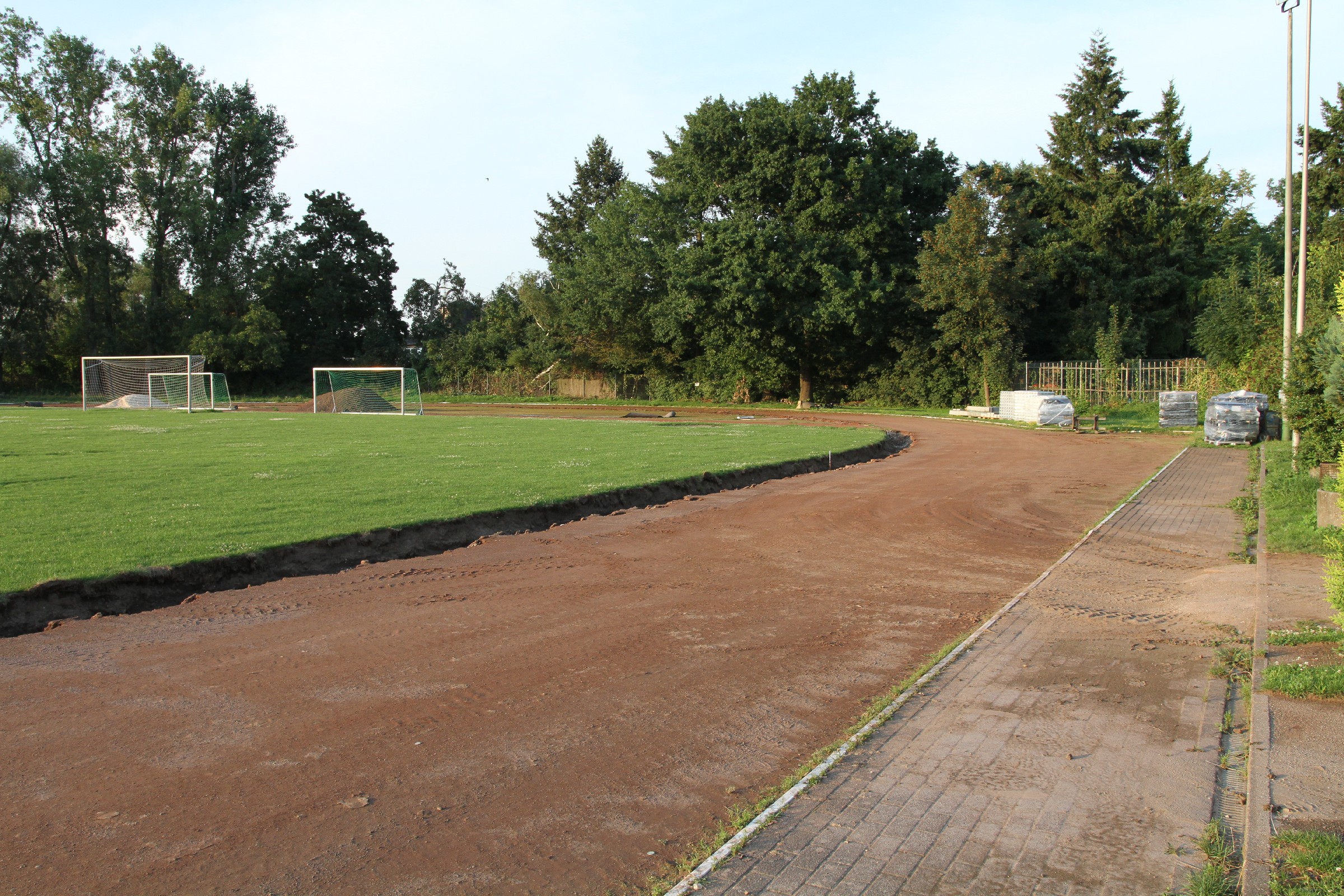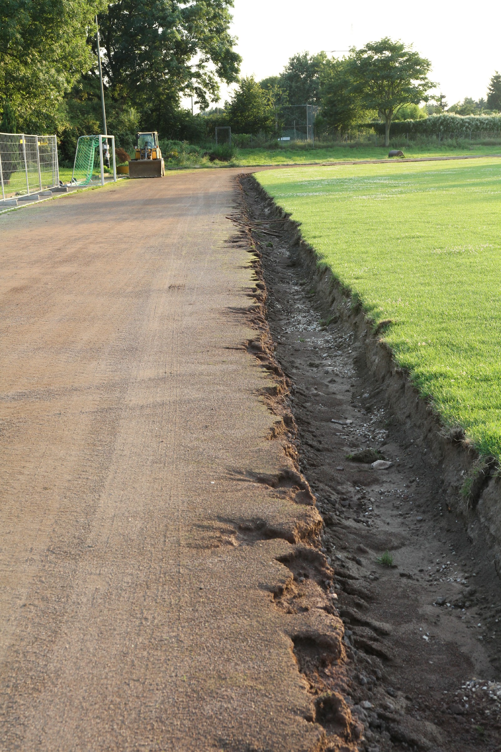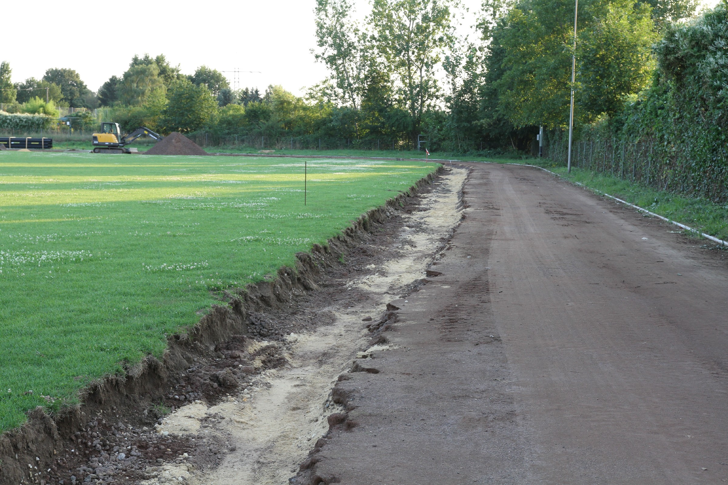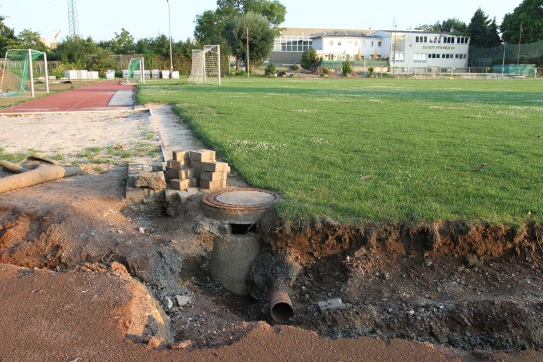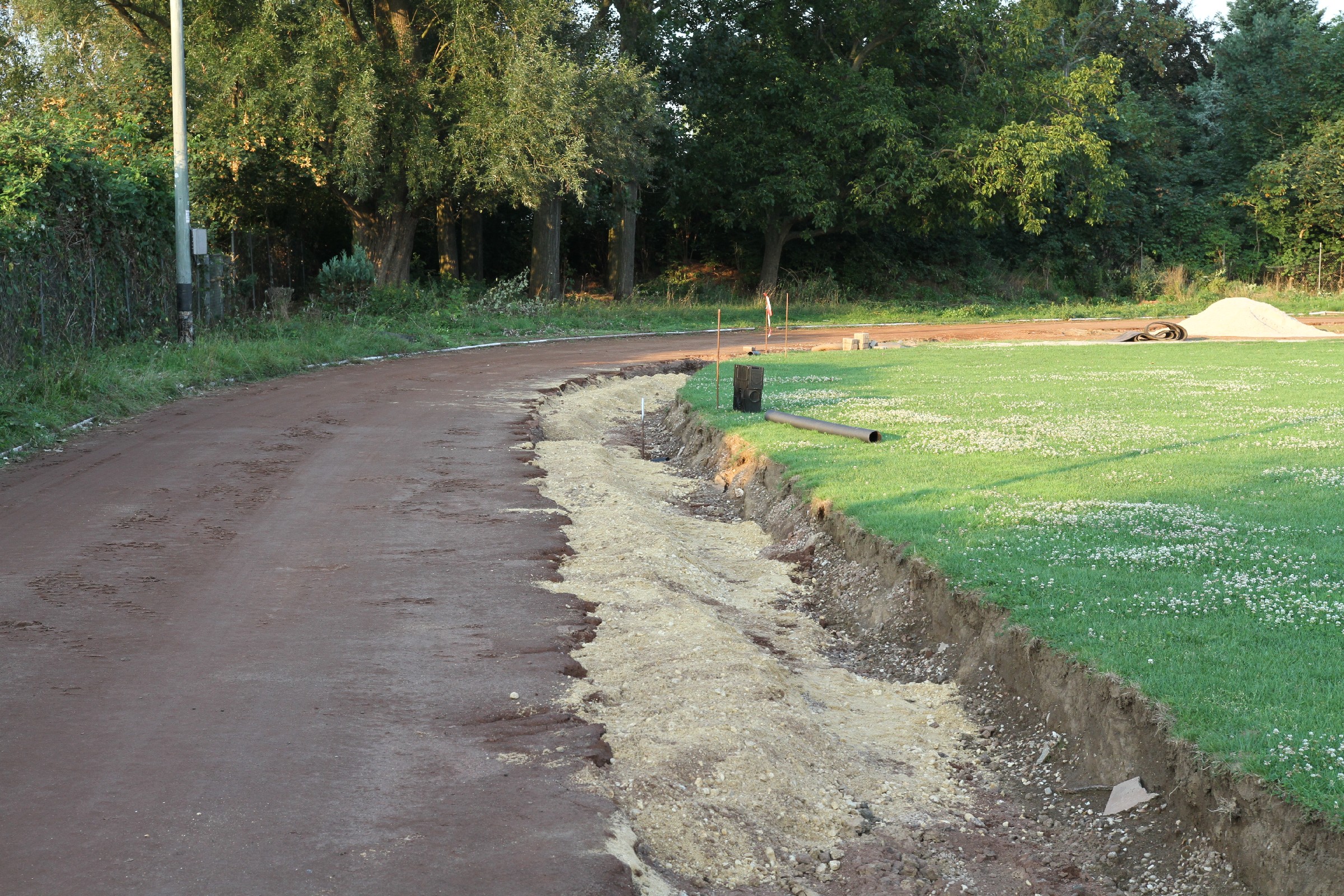 Die Bauarbeiten dauern nunmehr schon drei Wochen. Zeit für ein Zwischenfazit. Am Innenrand der Tartanbahn wurde die alte Oberflächenentwässerung entfernt. Am Nordrand und im größten Teil der Westkurve wurde eine Drainage eingebracht, die an zwei Stellen an die Kanalisation angeschlossen wurde. Hierzu wurden die Kanalschächte seitlich angeschnitten.