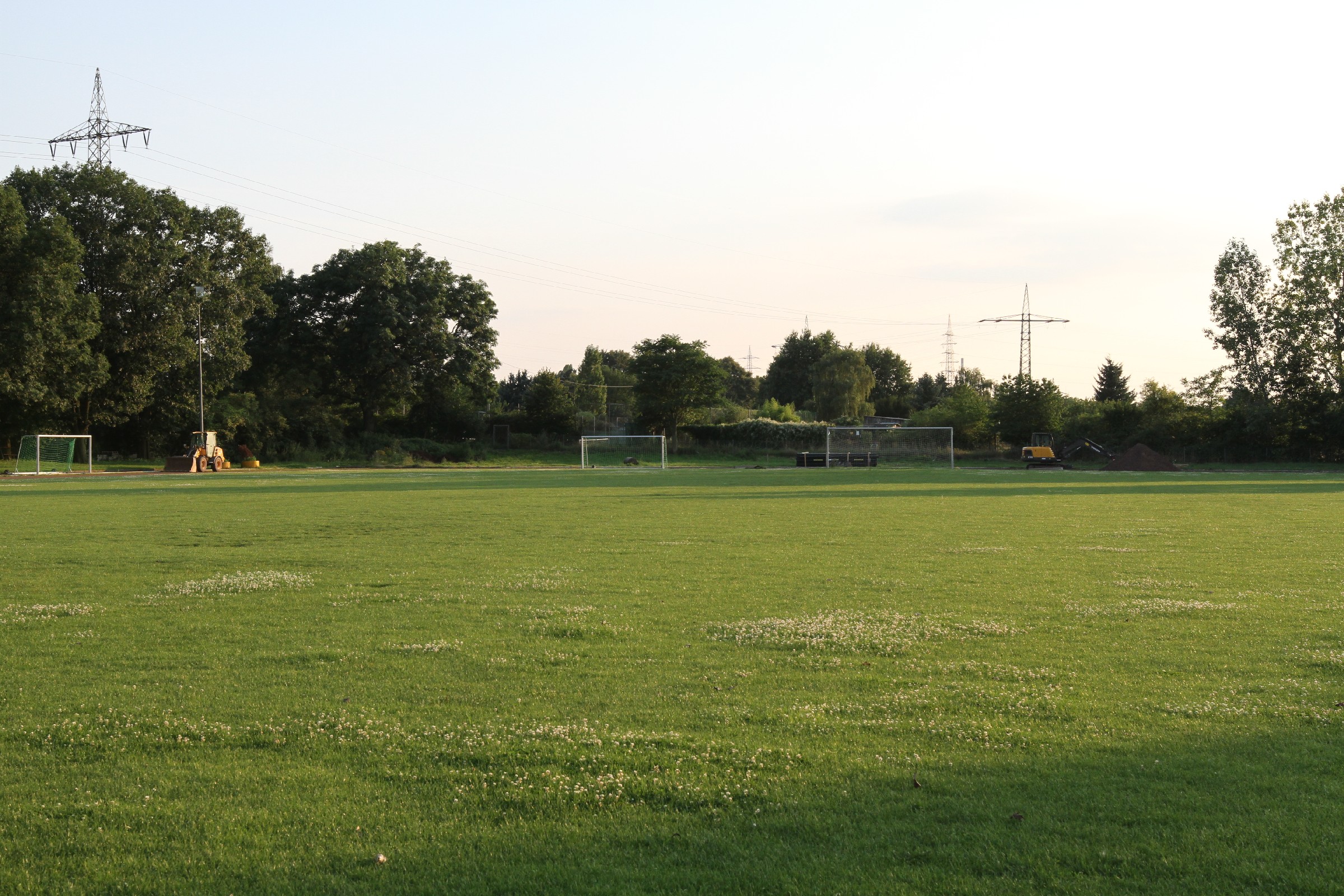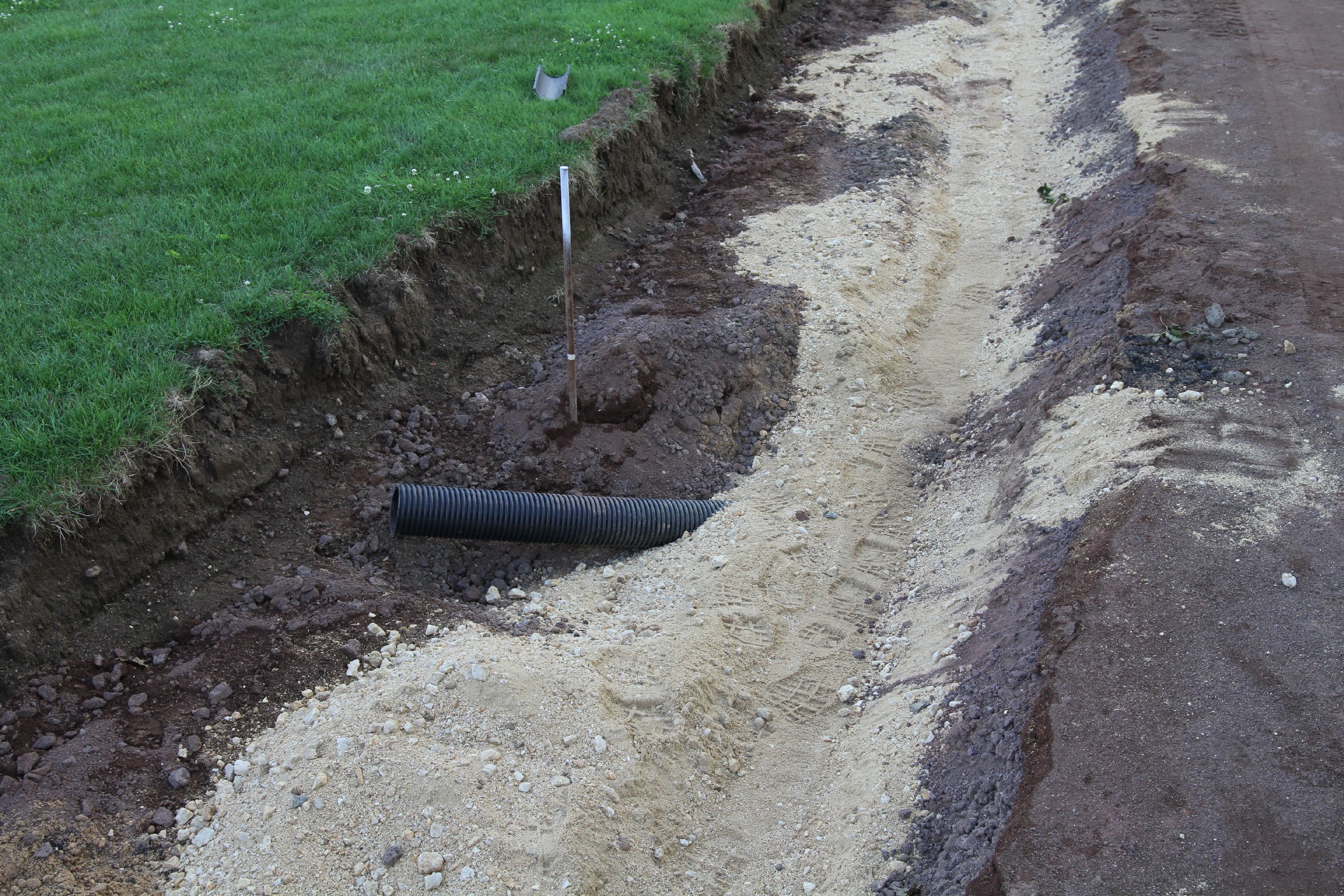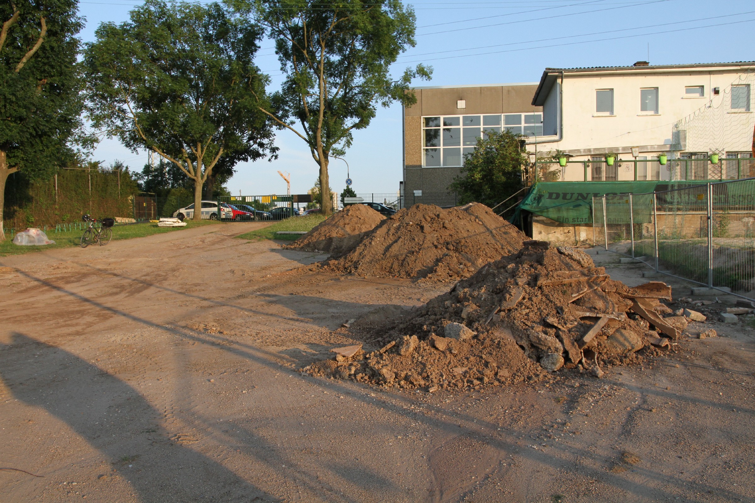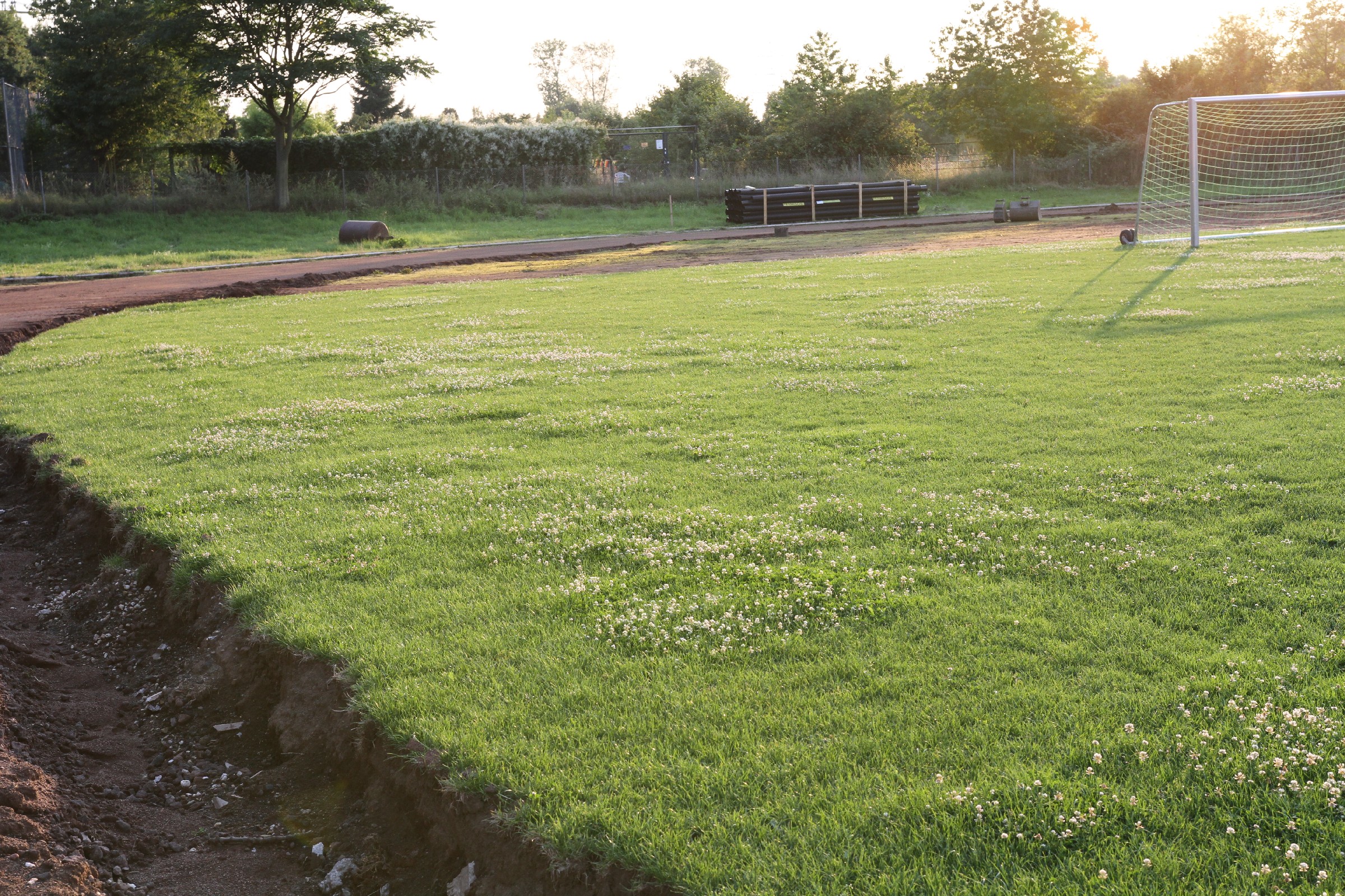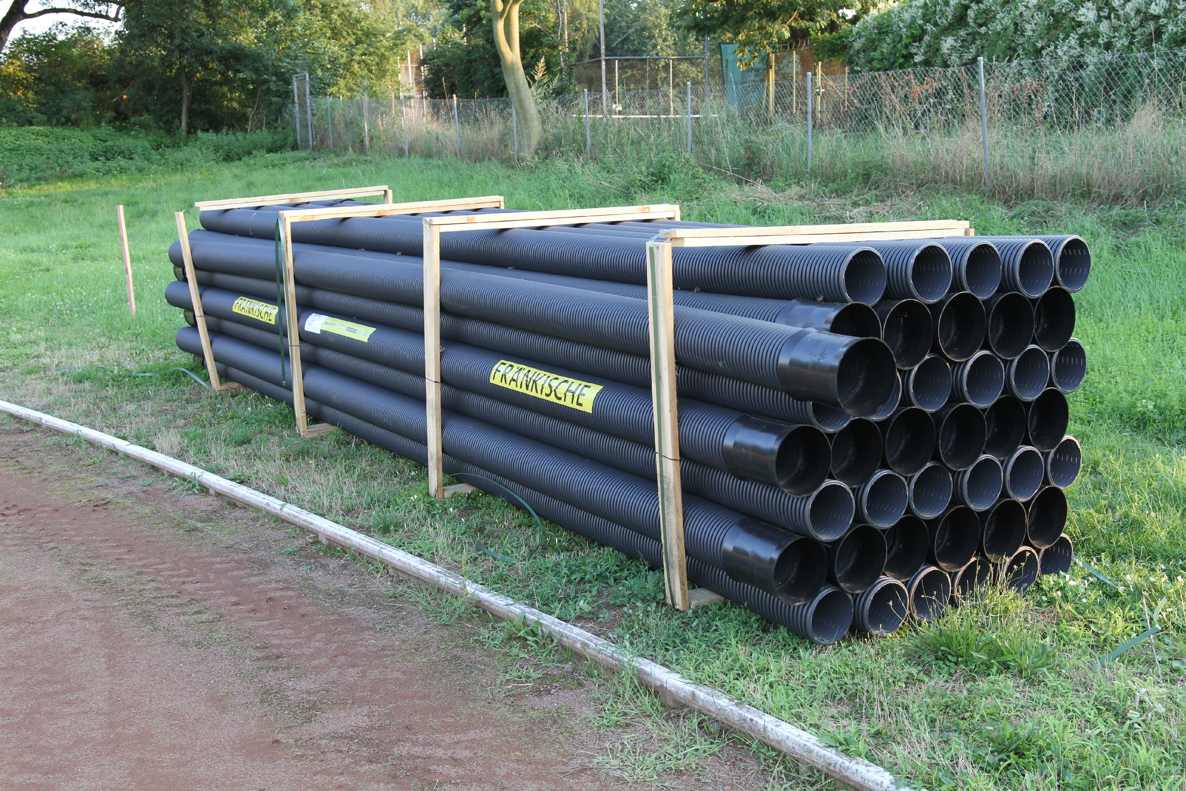 Die Bauarbeiten dauern nunmehr schon drei Wochen. Zeit für ein Zwischenfazit. Am Innenrand der Tartanbahn wurde die alte Oberflächenentwässerung entfernt. Am Nordrand und im größten Teil der Westkurve wurde eine Drainage eingebracht, die an zwei Stellen an die Kanalisation angeschlossen wurde. Hierzu wurden die Kanalschächte seitlich angeschnitten.