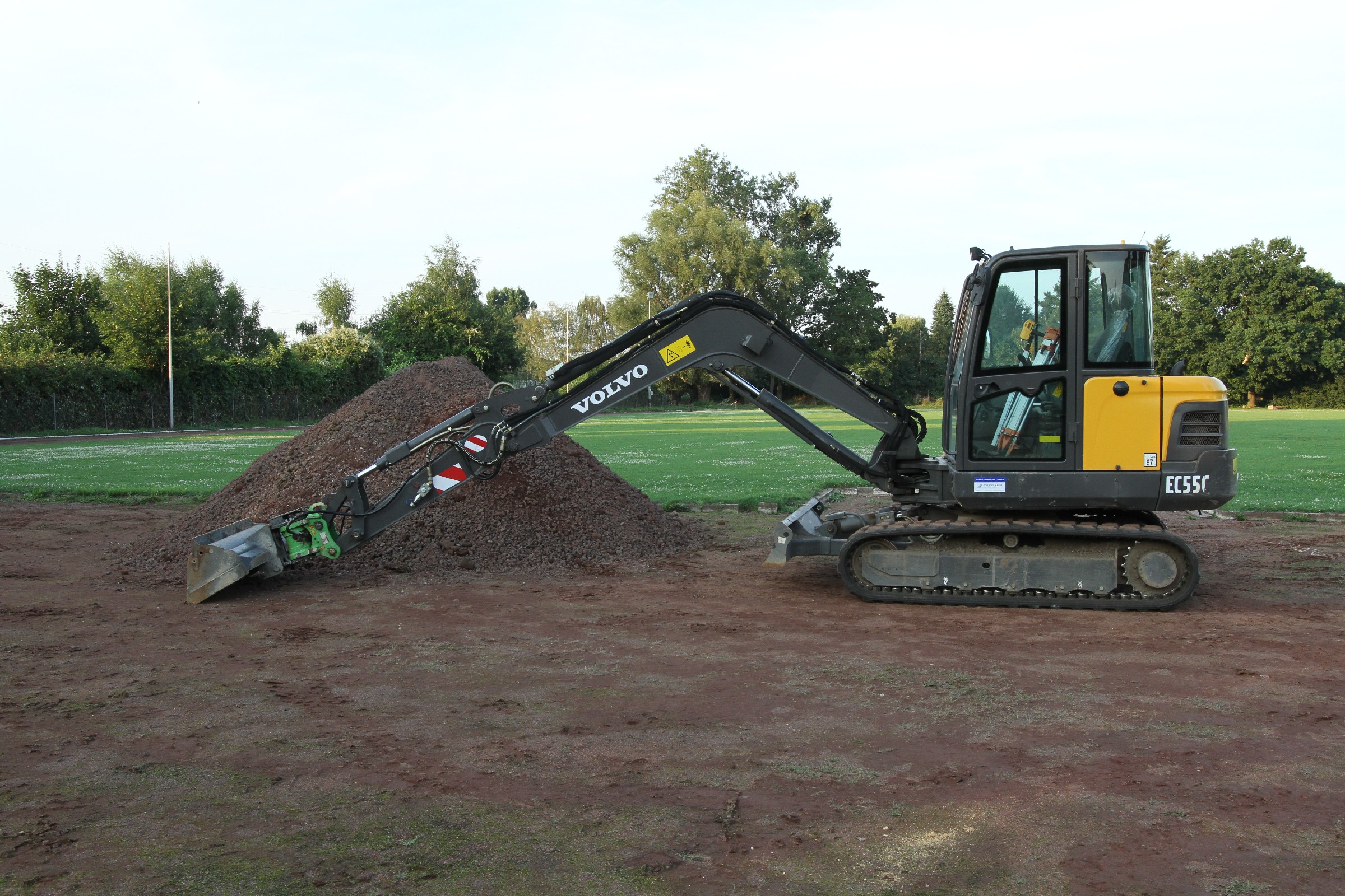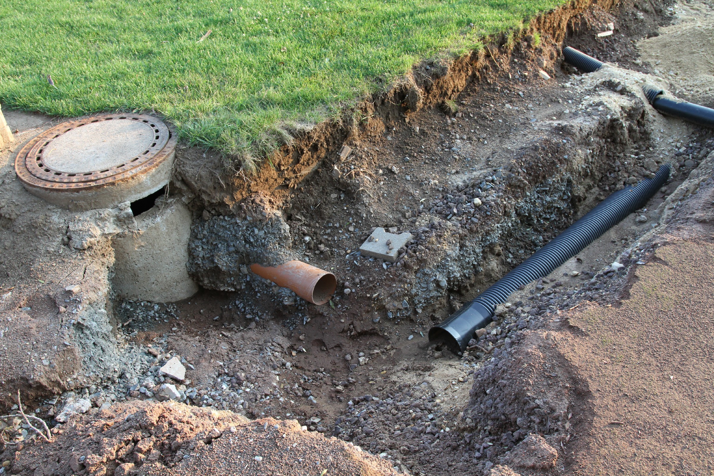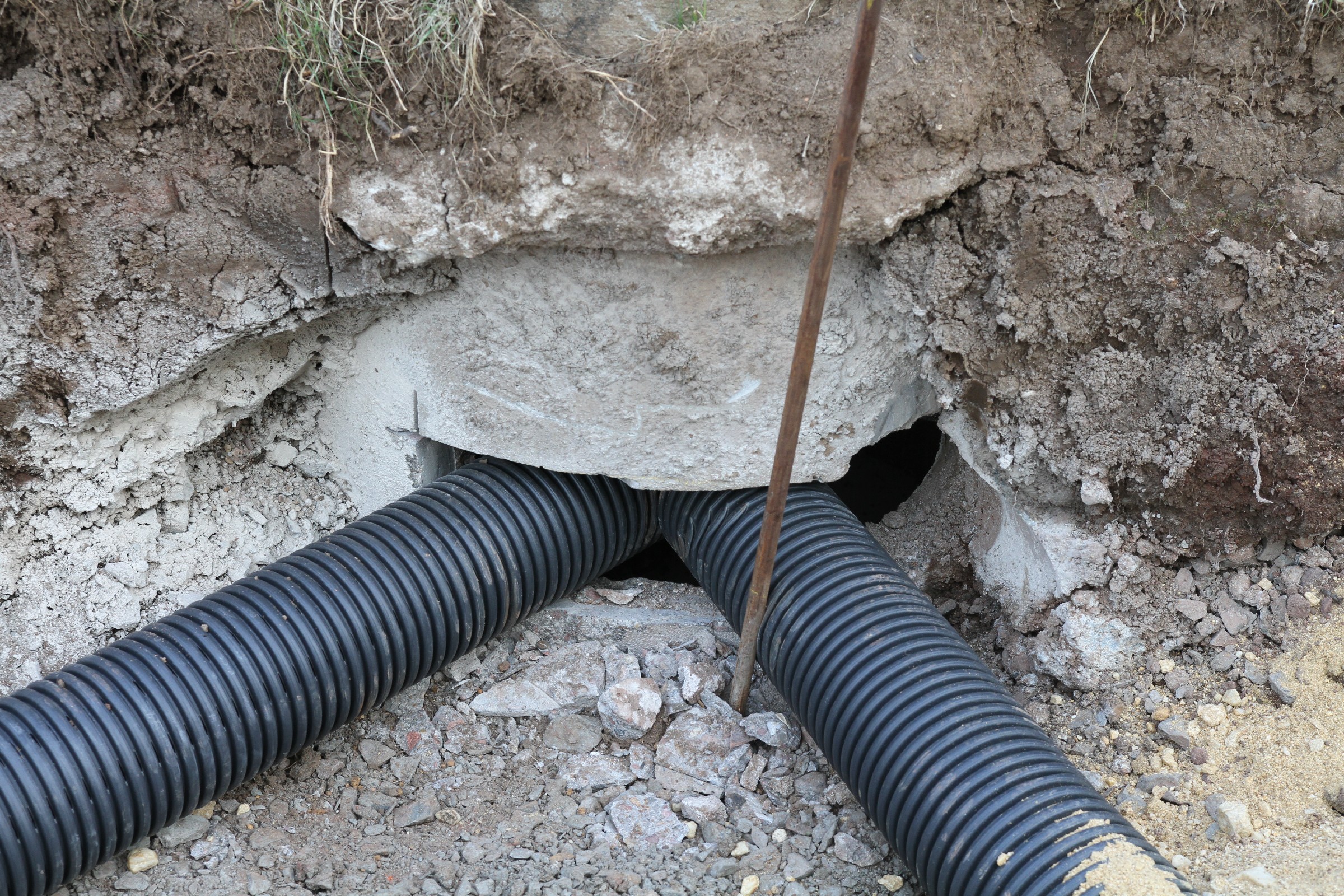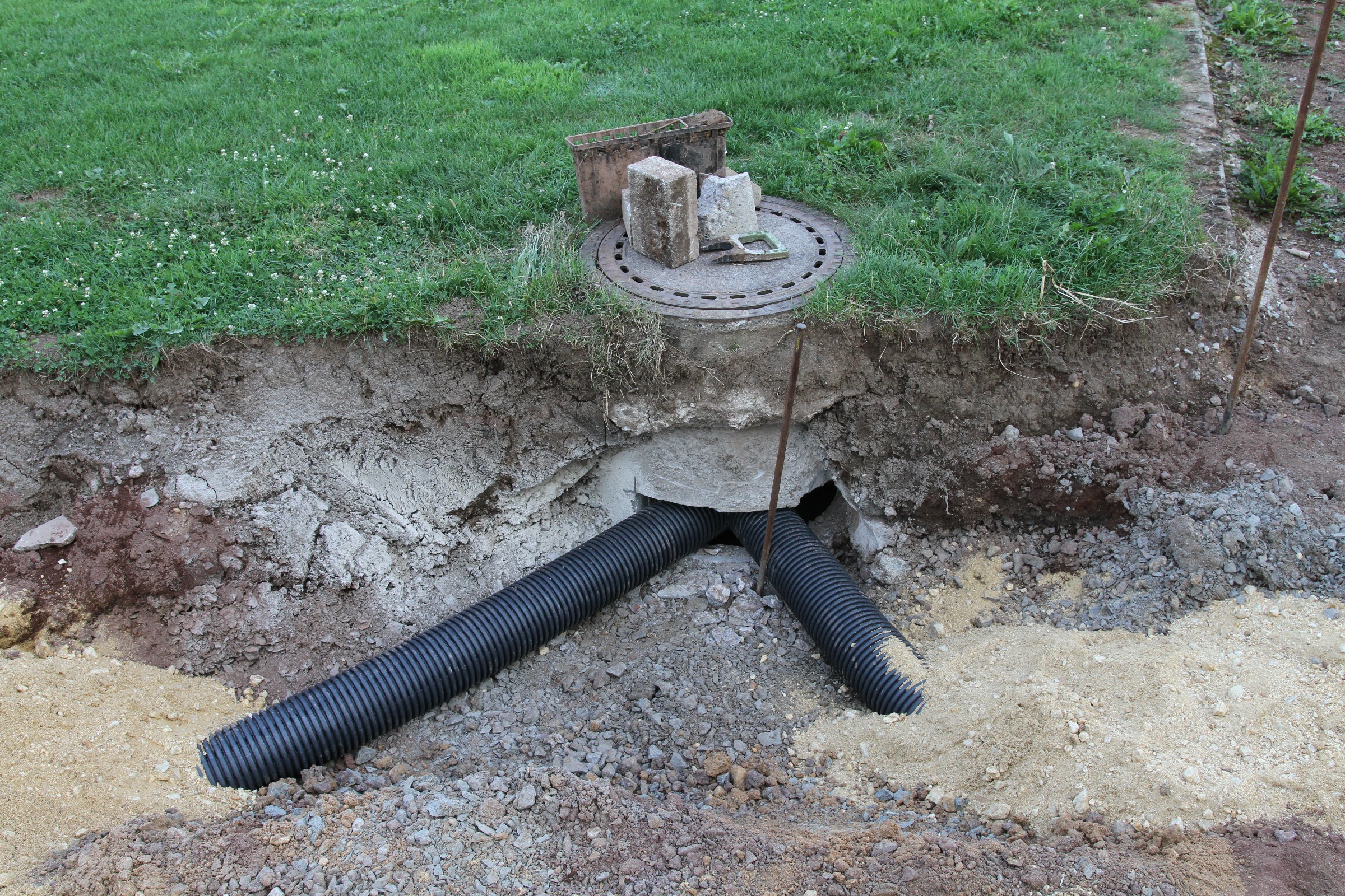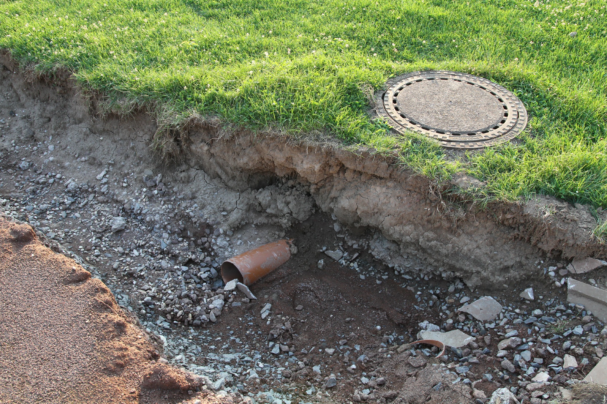 Die Bauarbeiten dauern nunmehr schon drei Wochen. Zeit für ein Zwischenfazit. Am Innenrand der Tartanbahn wurde die alte Oberflächenentwässerung entfernt. Am Nordrand und im größten Teil der Westkurve wurde eine Drainage eingebracht, die an zwei Stellen an die Kanalisation angeschlossen wurde. Hierzu wurden die Kanalschächte seitlich angeschnitten.
