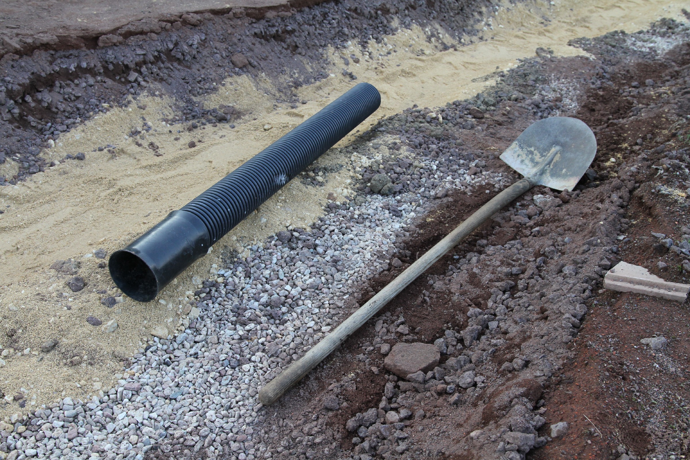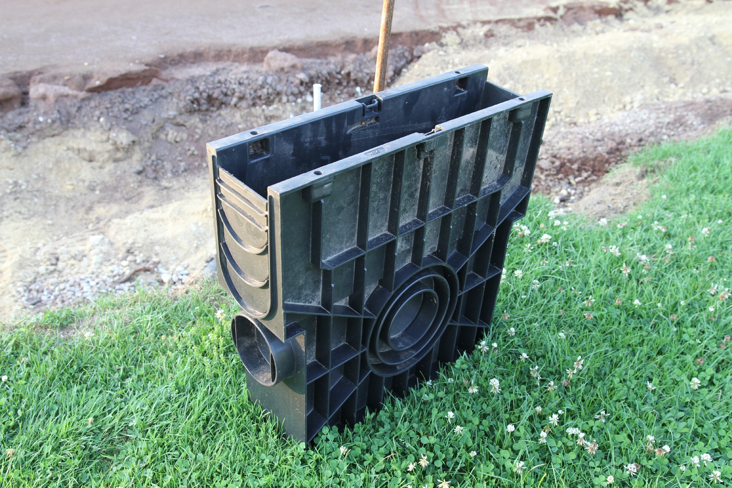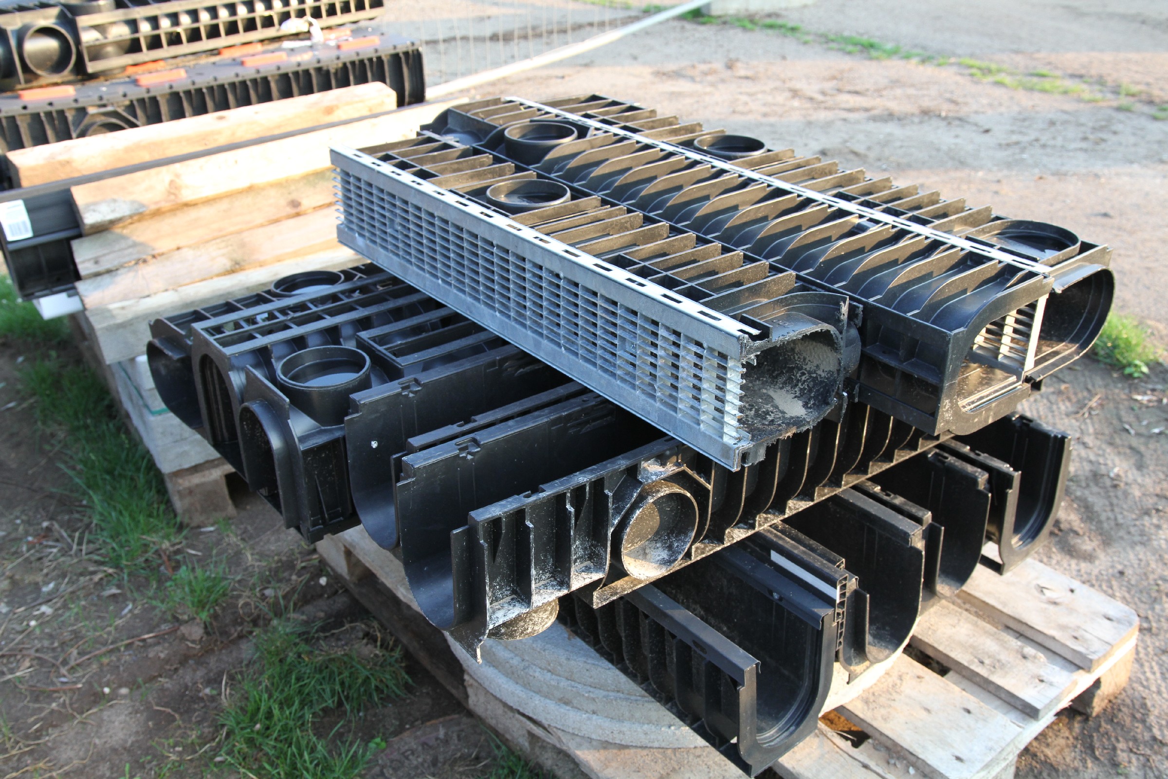 Auf der Baustelle liegen bereits die Entwässerungsrinnen und die dazu passenden Anschlussstücke bereit für die nächste Phase. Anders als die bisherigen Rinnen wird die neue Rinne einen Gitterrost haben.
